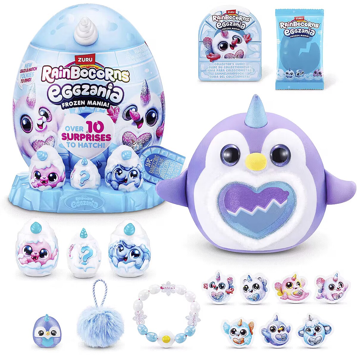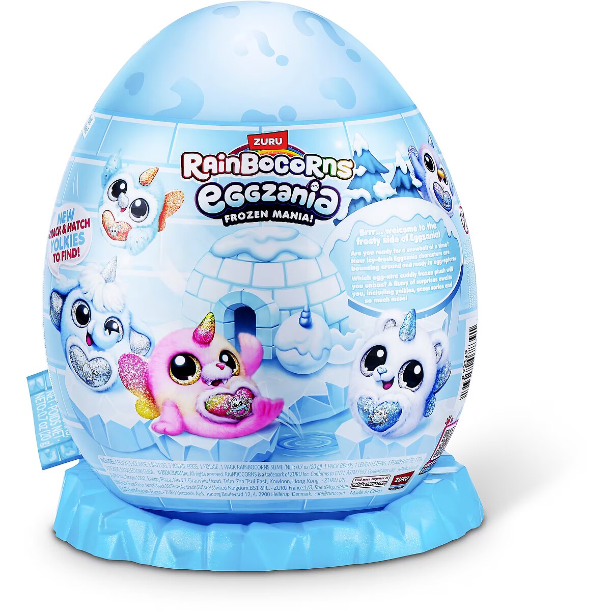 Packaging content - Packaging content - 1x Rainbocorns Eggzania Frozencorn Mania Plush; 1x Ice Base; 1x Egg; 3x Yolkie; 1x Pack Rainbocorns Slime; 1x Pack Beads; 1x String; 1x Furry Hair Tie; 1x Tag; 3x Stickers; 1x Collectors Guide