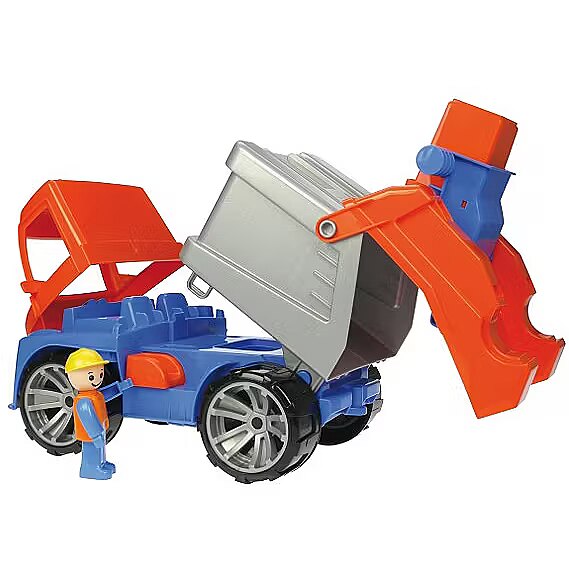 Description - Colorful garbage bin with a length of 29 cm, made of elastic plastic of high quality, meeting European standards. Functional car, tailgate flaps to place sand, for example, and the whole load can be tilted and poured into place.