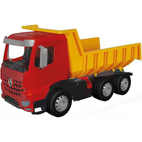 Description - Super tipper Mercedes Giants Dump Truck, model AROCS, triaxial, yellow cab, black chassis and silver trailer. Made of high quality materials that meet European standards. The vehicle has a trailer lock so the child can sit safely on it. This functional dump truck is 63 cm long and can withstand loads up to 150kg. Toy in open cardboard box.