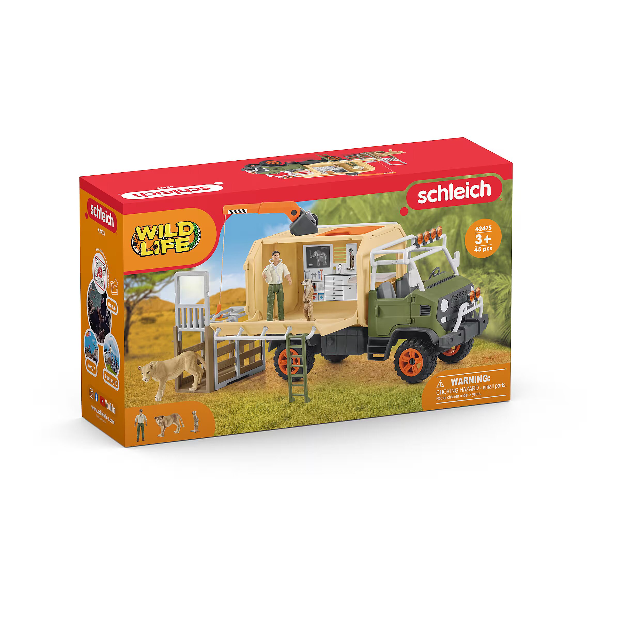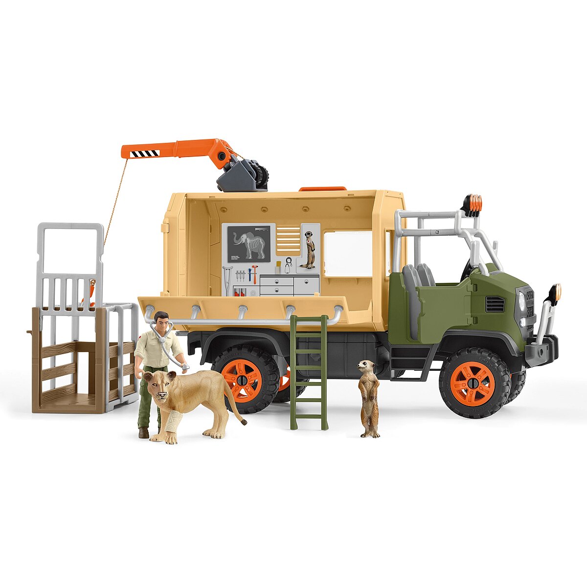 LongDesc - Like great stories...schleich® never goes out of play. Help Ranger Tom and his friend Ted the meerkat rescue the injured lioness with the Animal Rescue Large Truck! This animal rescue toy is a perfect gift for animal lovers ages 3 and up, and is a 2020 National Parenting Product Award (NAPPA) Winner. This set also plays nicely with our other toys, like the Croco Jungle Research Station.Ranger Tom and his friend Ted the meerkat are on a mission to rescue an injured lioness, and they need your help! Grab your medical supplies and journey to the savannah with the animal rescue truck from schleich® WILD LIFE. The award-winning Animal Rescue Large Truck playset from schleich® is your passport to hours of play and unbounded storytelling. The rescue truck is fully equipped with accessories, including a stethoscope and bandage for animals in need of medical care. Use the crane and winch to lift the lioness into the cage for safe transport! A meerkat figurine, lioness figurine, and Ranger Tom figurine are included. The animal rescue truck is part of an immersive world of imagination with other playsets from schleich® WILD LIFE (each sold separately). schleich® wild animal figurines and playsets for toddlers and kids introduce the limitless possibilities of storytelling and imaginative play. From realistic ocean and jungle animal figurines to our immersive playsets, schleich® WILD LIFE lets your stories run wild. Authentic wildlife figurines toys prowl, swim, and soar with rich, accurate detail and texture, while our full-featured wildlife playsets bring learning to life. Our wild animal toys love to cross into new play worlds to create stories with schleich® enchanted creature toys, farm animal figurines and dinosaur toys! schleich® wild animal toys and playsets are built to last for generations. All our toys meet the highest national and international safety standards.
