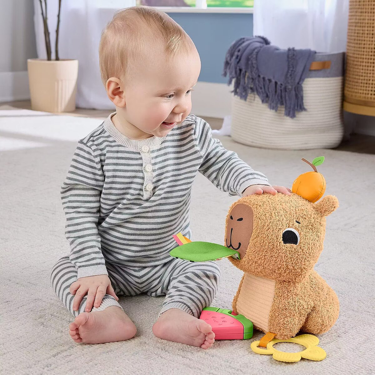 LongDesc - Cute, cuddly, and ready for play, the Snuggly Snacky Capy plush baby toy from Fisher-Price is packed with lots of sensory details for your little one to explore. With bright colours, textured fabrics and fun sounds, the capybara comes with his own “snacks” that are designed to engage your baby’s senses as they play. Sized just right for newborns, this soft, snuggly friend can help provide a sense of comfort and security for your little one at home or when traveling. Colours and decorations may vary.
