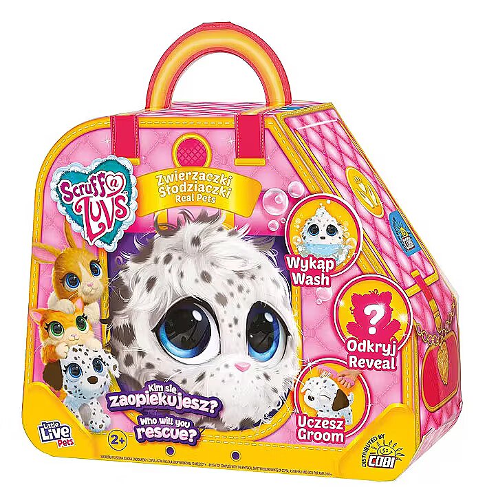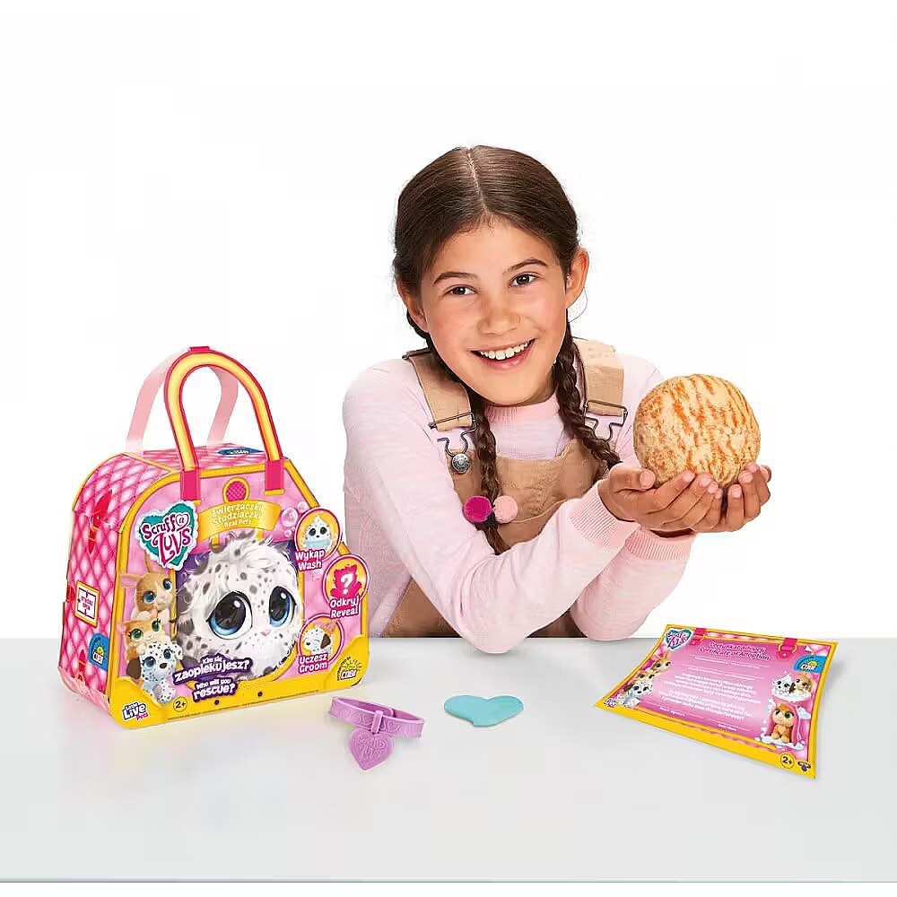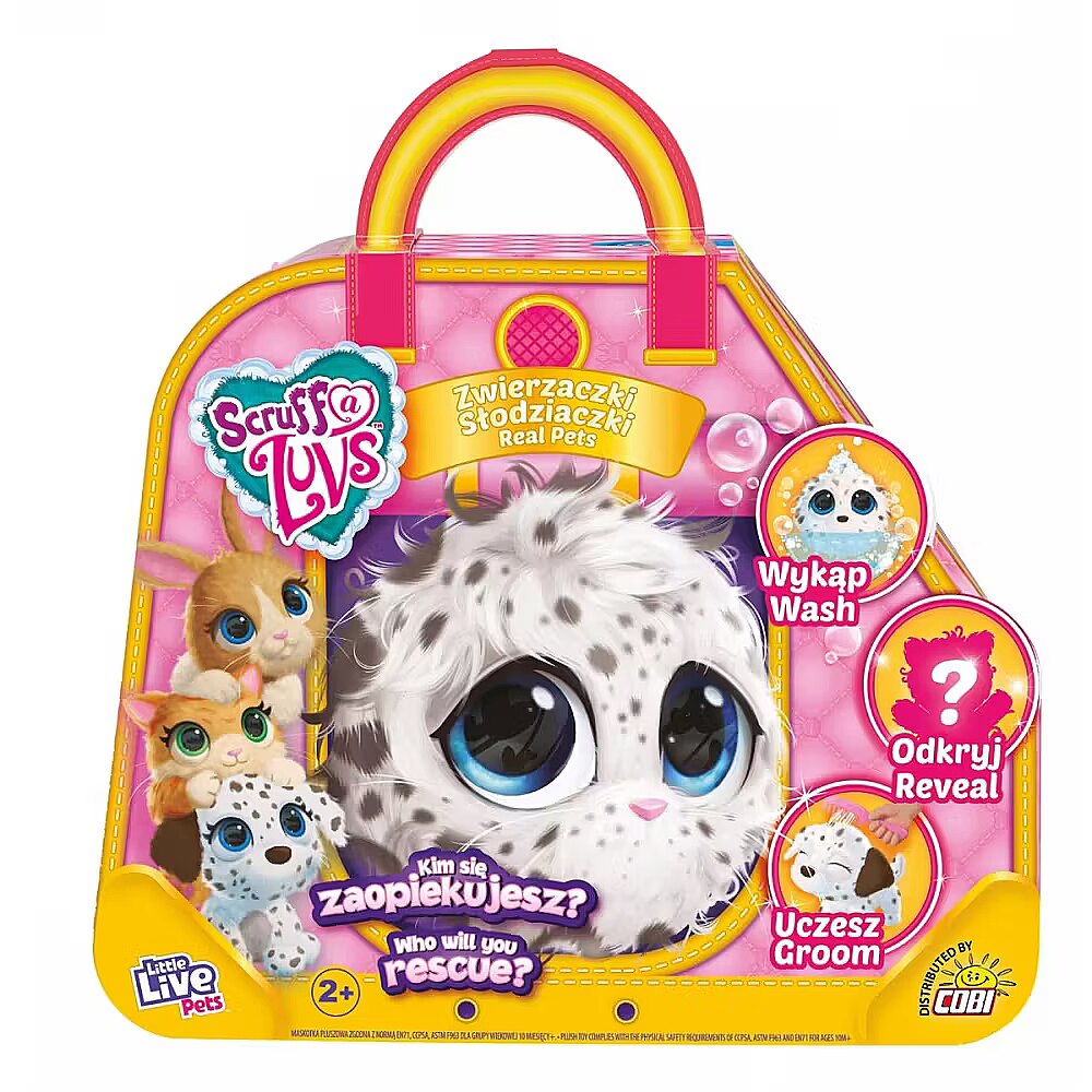 Description - Cute Animals Rescue abandoned pets with Scruff-a-Luvs! They need your love and help! Inside the box there is one mystery animal waiting to be rescued! Which Scruff-a-Luvs will you save? Will you find a Scruff-a-Luvs bunny, puppy or maybe a cat inside? At first, the animal looks like a sad, furry ball, but when you bathe it, you will reveal its real fur. Dry them, comb them with a comb and put on a collar. All Scruffs have "soft-touch" fur, which makes them even cozier and you will love them faster!
