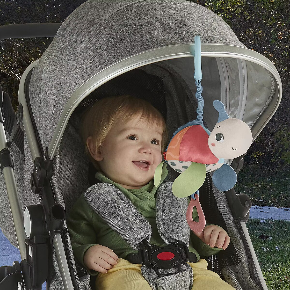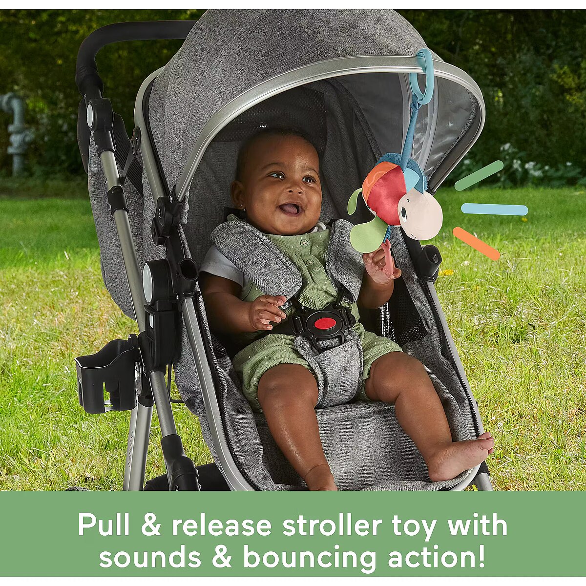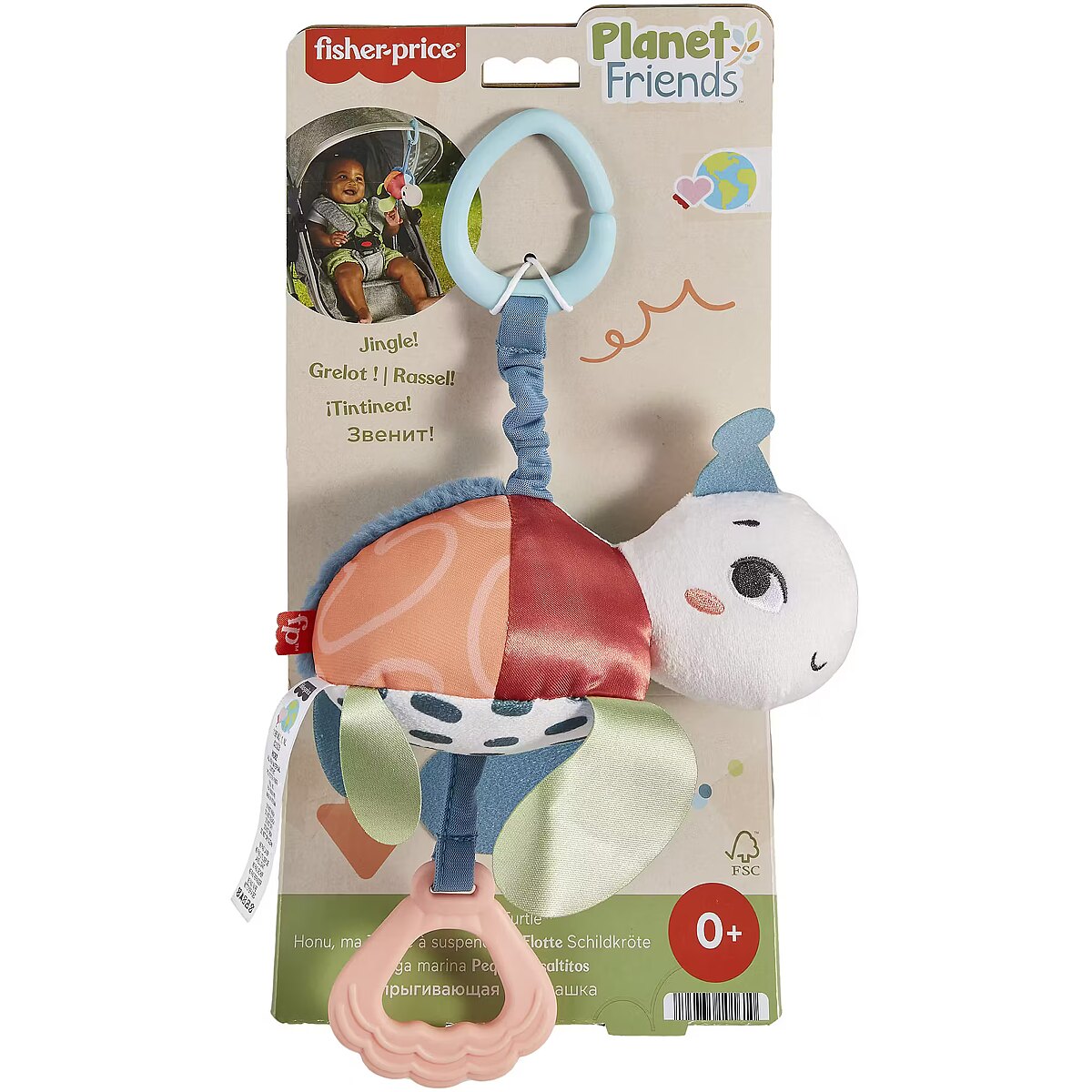 LongDesc - Inspired by animals that are endangered or vulnerable, the Planet Friends Sea Me Bounce Turtle plush stroller toy from Fisher-Price uses fabric made from 80% post-consumer recycled plastics and comes in comes in packaging made from FSC-certified paper to support responsible forestry. The toy features a variety of different tactile and visual elements for engaging sensory play and has a pull and release handle that activates the fun jingle sounds and bouncing action. The handle also doubles as a BPA-free seashell teether. This toy easily links to a stroller canopy, baby gym or diaper bag for travel use. (FSC C172210, 2021)