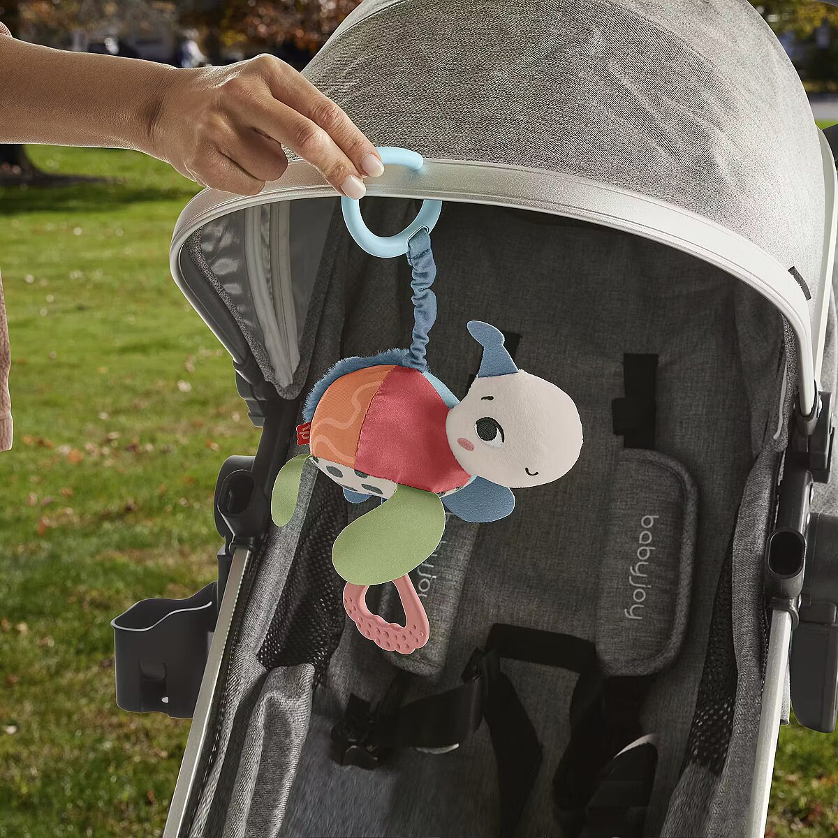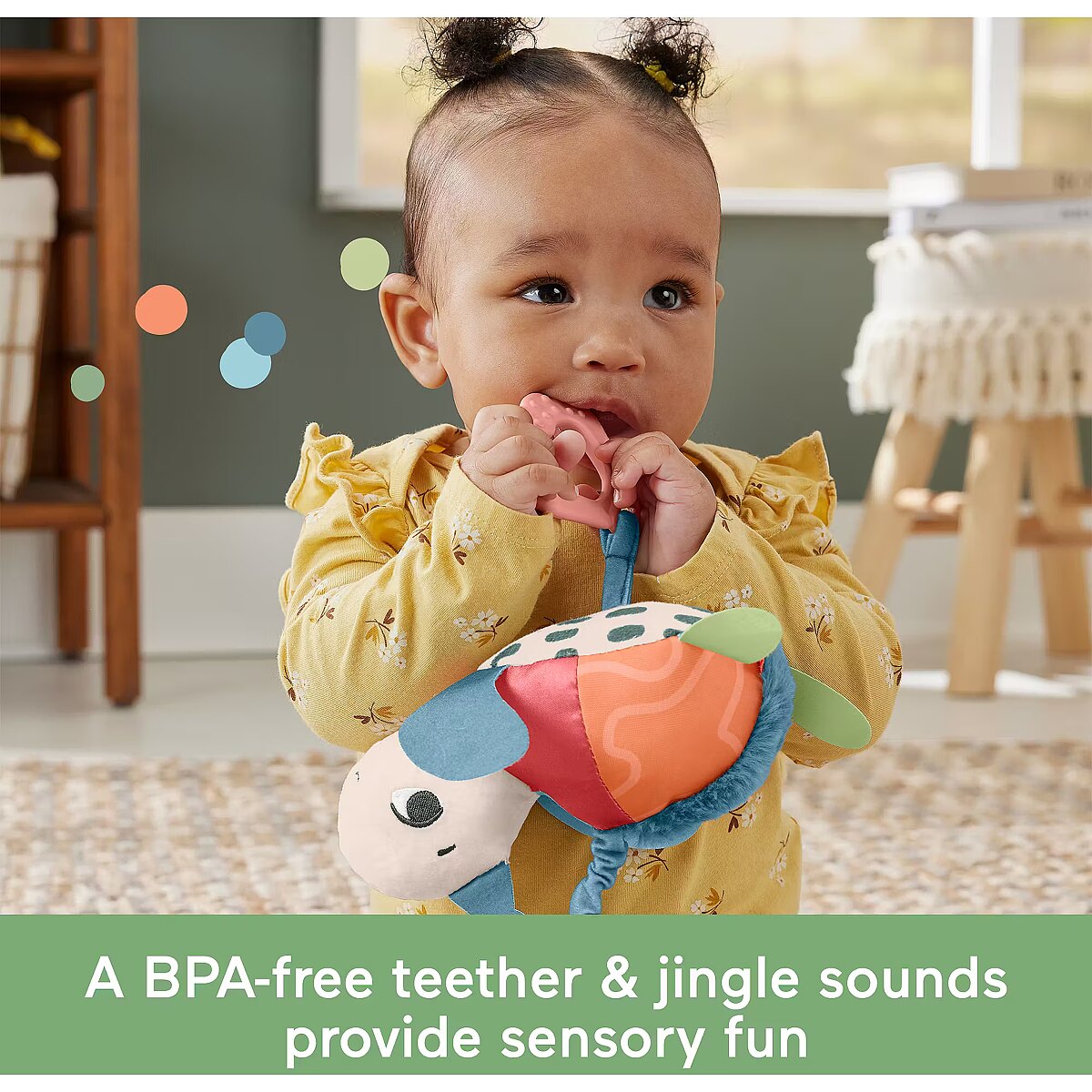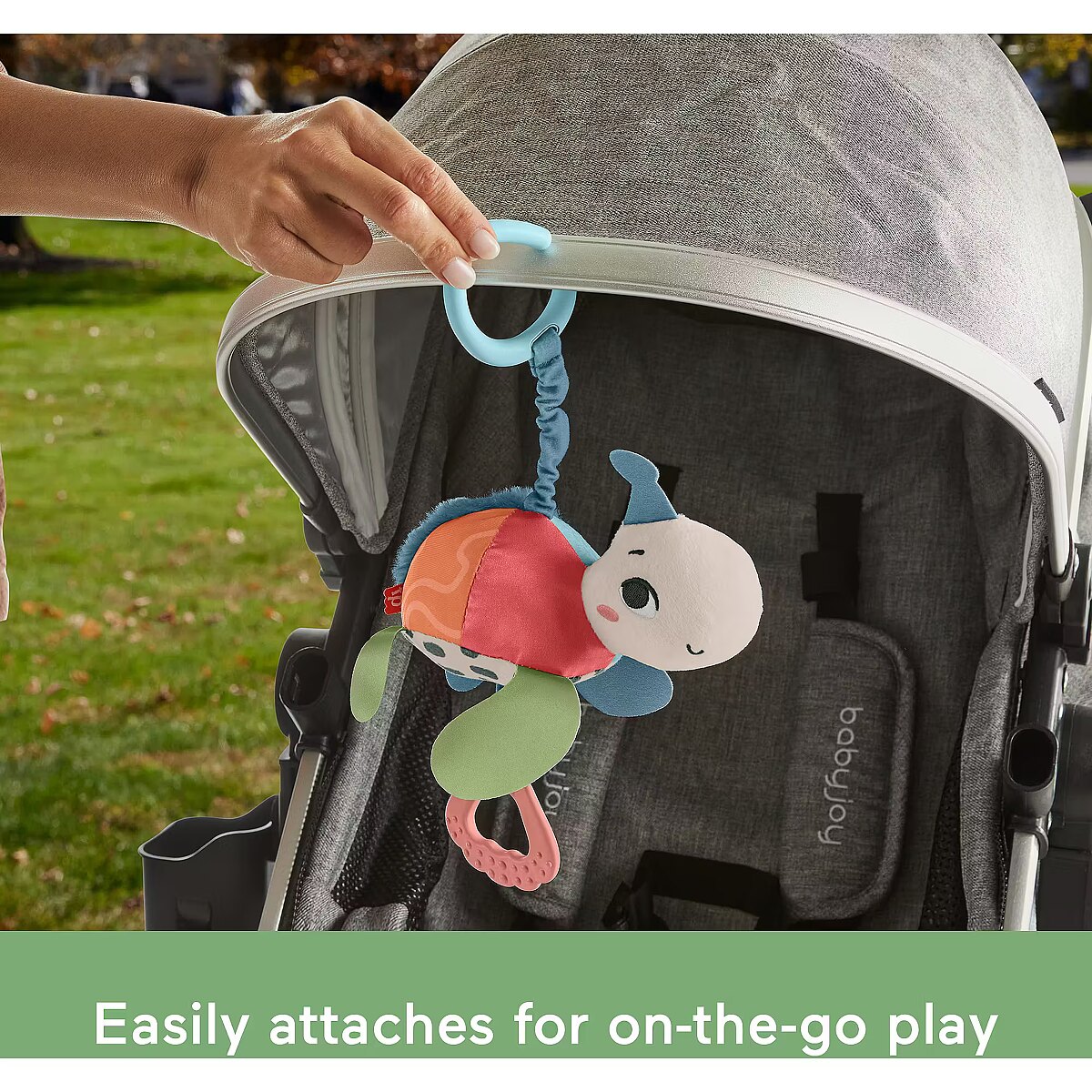 LongDesc - Inspired by animals that are endangered or vulnerable, the Planet Friends Sea Me Bounce Turtle plush stroller toy from Fisher-Price uses fabric made from 80% post-consumer recycled plastics and comes in comes in packaging made from FSC-certified paper to support responsible forestry. The toy features a variety of different tactile and visual elements for engaging sensory play and has a pull and release handle that activates the fun jingle sounds and bouncing action. The handle also doubles as a BPA-free seashell teether. This toy easily links to a stroller canopy, baby gym or diaper bag for travel use. (FSC C172210, 2021)