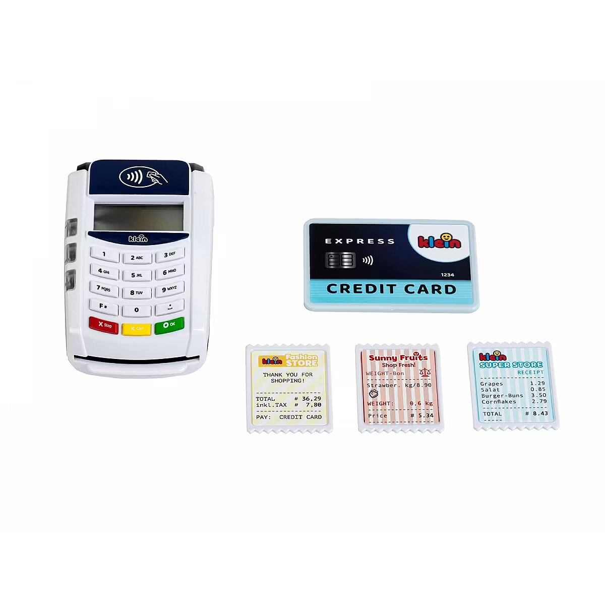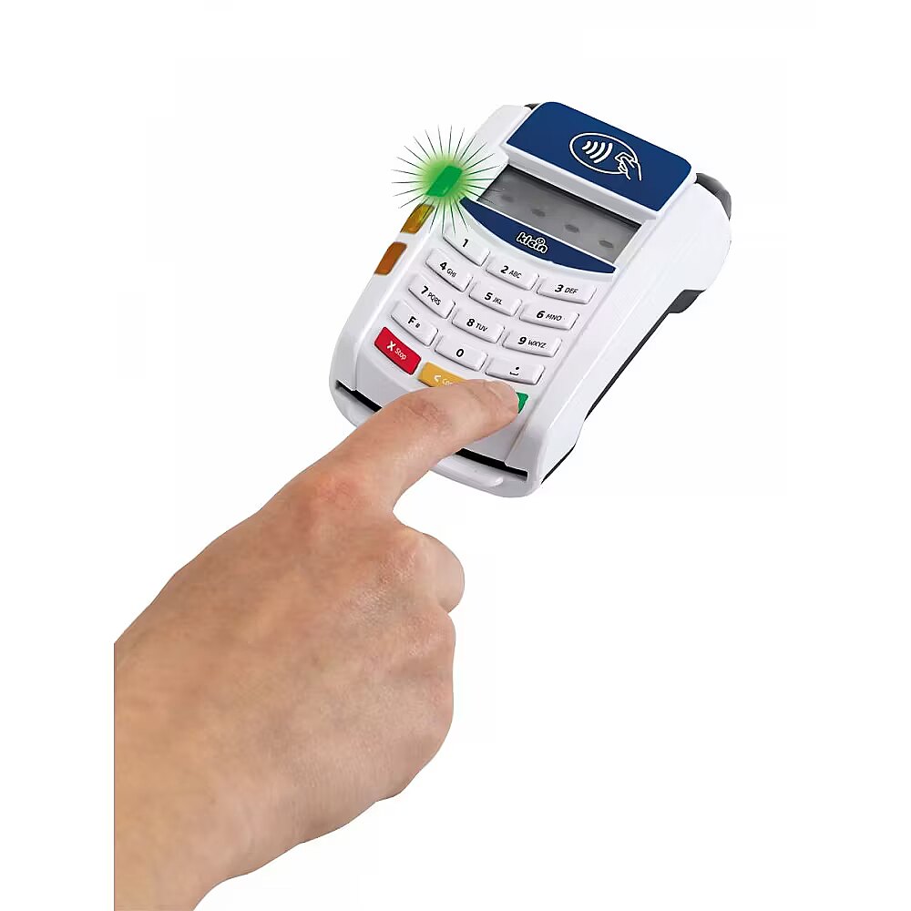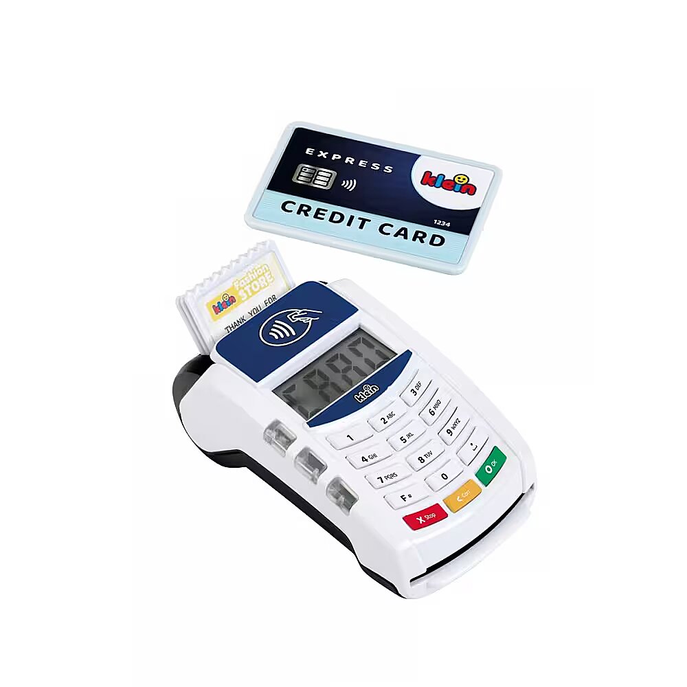 Description - Payment terminal II The payment terminal, created by Klein, is in white and blue with a white keyboard panel. The toy is made of high-quality plastic and has many functions that will interest any small shop owner. This toy checkout accessory brings a breath of modern technology into a child's room. Here, contactless payments become a form of play, but also a form of learning reality. The payment terminal is deceptively similar to a real device. It has functioning buttons and a contactless payment sensor. During use, it emits a gentle light and makes sounds. During play, all you have to do is enter and confirm the amount, place the card on the terminal, enter and confirm the PIN, and payment is ready. Sliding the included credit card through the reader is accompanied by realistic sounds, just like in the real device. Batteries, which are not included in the kit, are required for proper play. Included with the terminal is one 1 credit card with contactless payment function, as well as 3 toy receipts. Talking to customers at the modern payment terminal teaches children communication skills, and manipulating the credit card supports motor development.