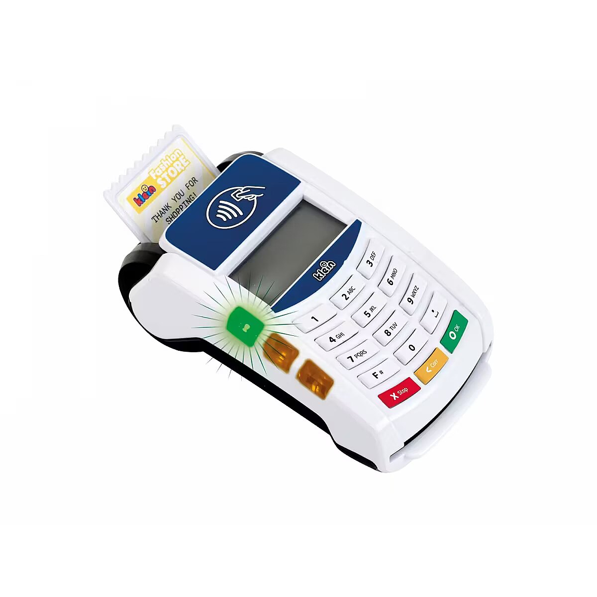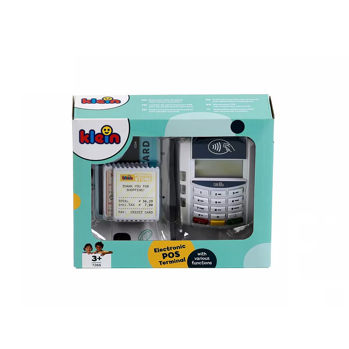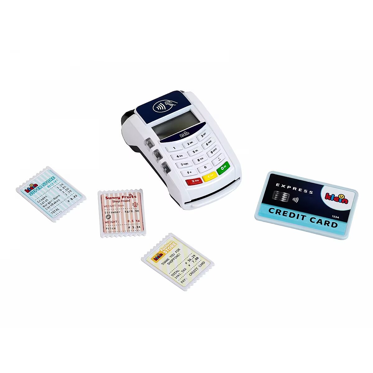 Description - Payment terminal II The payment terminal, created by Klein, is in white and blue with a white keyboard panel. The toy is made of high-quality plastic and has many functions that will interest any small shop owner. This toy checkout accessory brings a breath of modern technology into a child's room. Here, contactless payments become a form of play, but also a form of learning reality. The payment terminal is deceptively similar to a real device. It has functioning buttons and a contactless payment sensor. During use, it emits a gentle light and makes sounds. During play, all you have to do is enter and confirm the amount, place the card on the terminal, enter and confirm the PIN, and payment is ready. Sliding the included credit card through the reader is accompanied by realistic sounds, just like in the real device. Batteries, which are not included in the kit, are required for proper play. Included with the terminal is one 1 credit card with contactless payment function, as well as 3 toy receipts. Talking to customers at the modern payment terminal teaches children communication skills, and manipulating the credit card supports motor development.