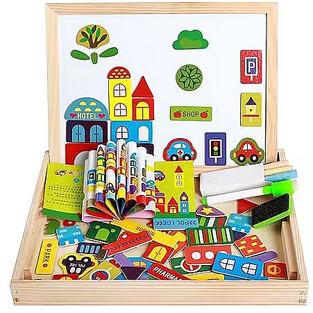 description_en - Double-sided wooden board with magnetic puzzles for arranging pictures.