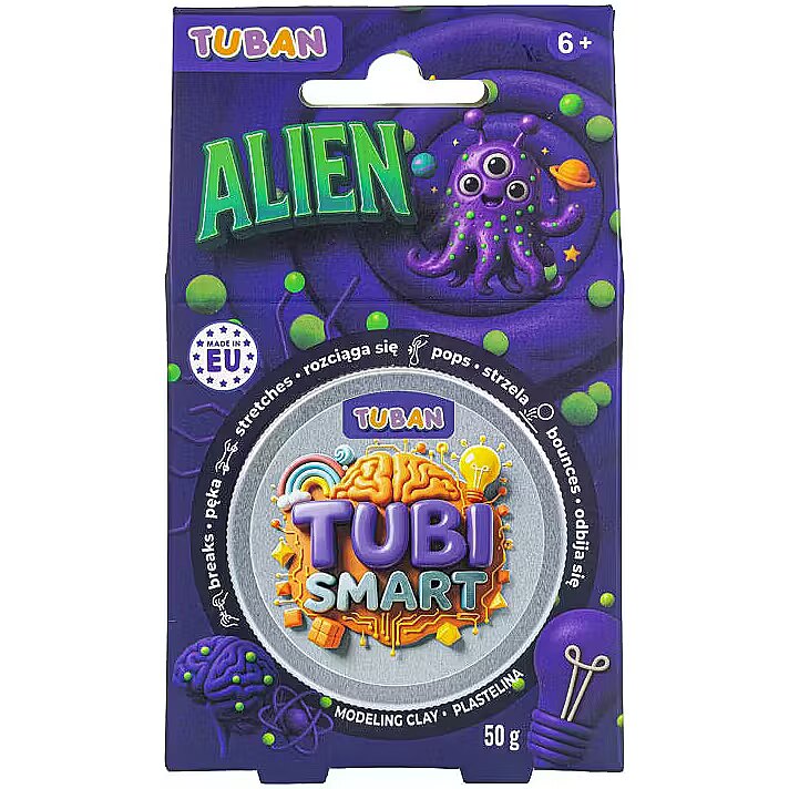 Description - Tubi Smart Playdough - Alien 50g Discover a modeling clay in a unique purple color, to which you can add yellow beads for even more fun. This extraordinary clay stretches, breaks, and bounces, bringing loads of joy with every touch! You can knead it, shape it, and experiment with endless new ways to play-only your imagination sets the limit. When playtime is over, simply store the clay in a sealed jar to enjoy its amazing properties for a long time. MADE IN POLAND.