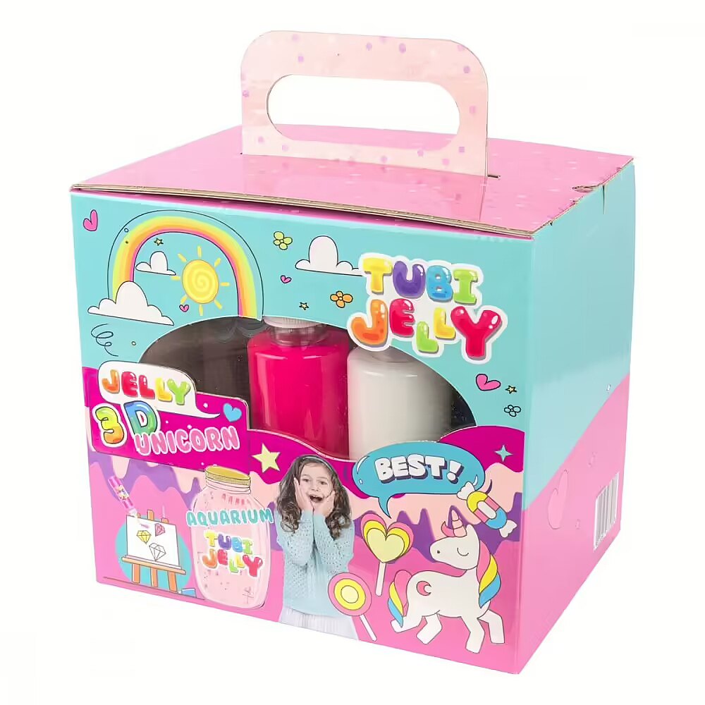 Description - TUBI JELLY SET 6 COLOURS + SMALL AQUARIUM - UNICORN Tubi Jelly is a new plastic mass which, when combined with the right activator, will allow you to create three-dimensional figures with gel consistency. What sets us apart is certainly the LARGE packs of gel liquid - as much as 150 ml capacity! Each set with a small aquarium contains gels in 6 different colours.6 x gel liquid 150 ml 9 designs on foil Clear foil 3 x activator 5 g Bowl