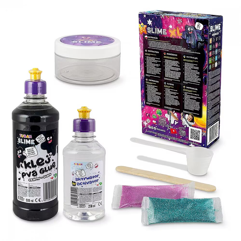 Description - DIY Galaxy Slime Kit XL The DIY GALAXY SLIME kit has been inspired by the galaxy in the sky. Consisting of black PVA glue, an activator and neon glitter additives, the kit allows you to create a glitter glue that looks like it exists in space.  Simply combine the glue with the correct amount of activator and then add the included additives to the whole. The resulting plastic mass will delight even the most demanding fans of the popular SLIME, and its properties will fully meet their expectations. The XL set was enriched with a container for storing the self-prepared glue.