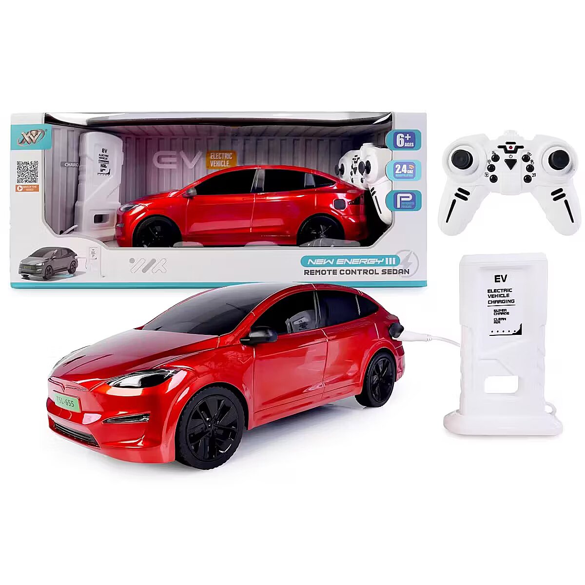 Description - Included in the set: a car (length 30 cm), a standing USB charger in the shape of a charging station (height 13 cm), a controller. Functions: full driving range, demo mode, 2 programmed sequences of parking and turning maneuvers, horn sound activated by a button, illuminated front and rear lights, turn signal sound and flashing indicators when turning, various front light modes (color and display pattern changes), wheel alignment adjustment, rubber side mirrors and wheels, illuminated LEDs on the charging station, charging port located at the fuel filler position, 4 built-in melodies; frequency: 2.4 GHz.