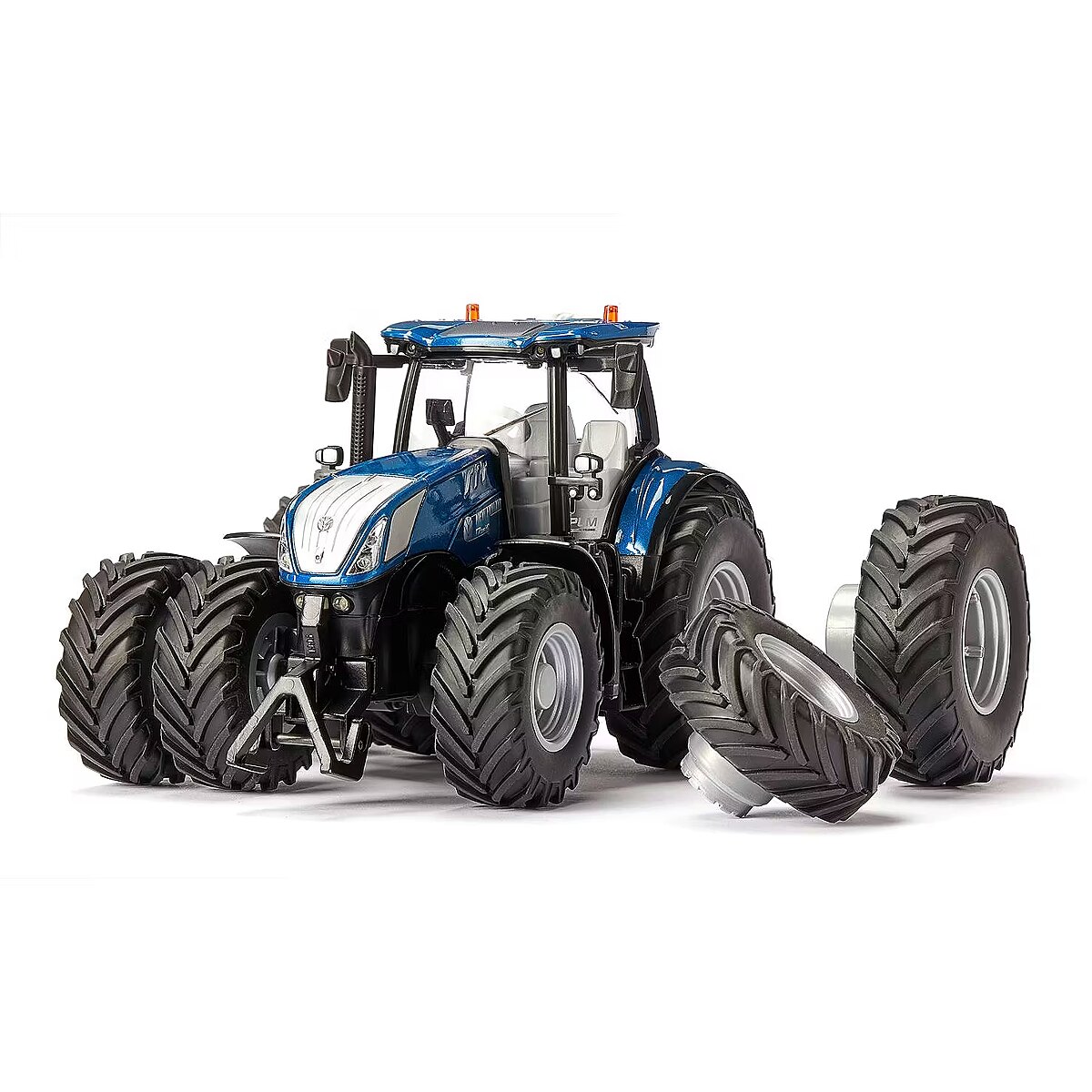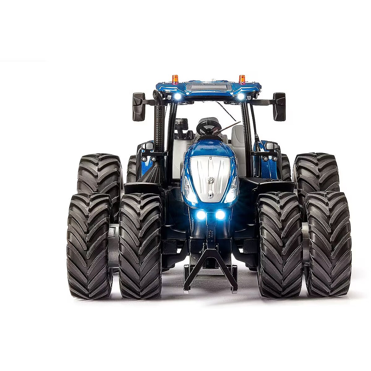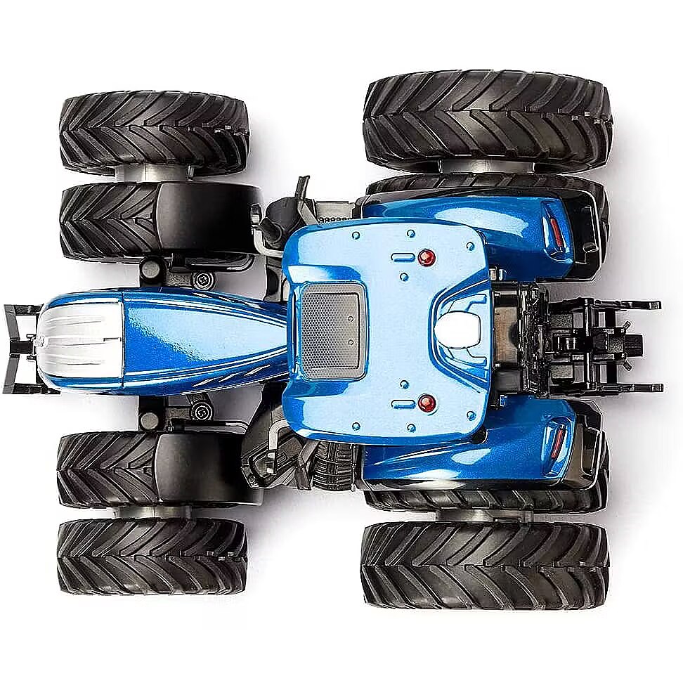 LongDesc - Versatility and strength – those are what the modern T7 Heavy Duty from New Holland represents. More strength, more lifting power, more flexibility, more comfort – the premium tractor in the 7 series was designed for modern agricultural operations requiring the highest standards. With the T7, up to 315 HP are available for using the heaviest working equipment. The very top model among the large tractors is strong enough for traction tasks, soil cultivation, baling, and transport. With Bluetooth control, the New Holland T7 from SIKU CONTROL provides really varied playing fun. Its bodywork is metal, and the interior of the glazed cab is highly detailed. Visually too the large tractor from the SIKU CONTROL series really creates an impression: The special dark blue metallic New Holland colour and the silvered rims emphasise its modern design. The magnetic twin tyres are a highlight and give the model additional stability and a particularly bulky appearance. The integrated magnets make fitting and removing the wheels child’s play. Using the SIKU CONTROL app, the three gears, 12 LEDs, and numerous tractor functions can be operated from a Smartphone or tablet. Driving and steering functions are controlled proportionally – optionally via the virtual gamepad controller or via the movement sensor of the mobile devices. The SIKU CONTROL app can be downloaded free of charge from the App Store and the Google Play Store. Settings and functions of the app are continuously updated. By means of the OTA (over the air) function, all updates for the model are automatically downloaded at the app’s system start. The remotely controlled tractor requires three AAA batteries as the power supply. The siku standard couplings at front and rear mean that the New Holland tractor can be combined with all trailers and accessories from the siku Farmer series.