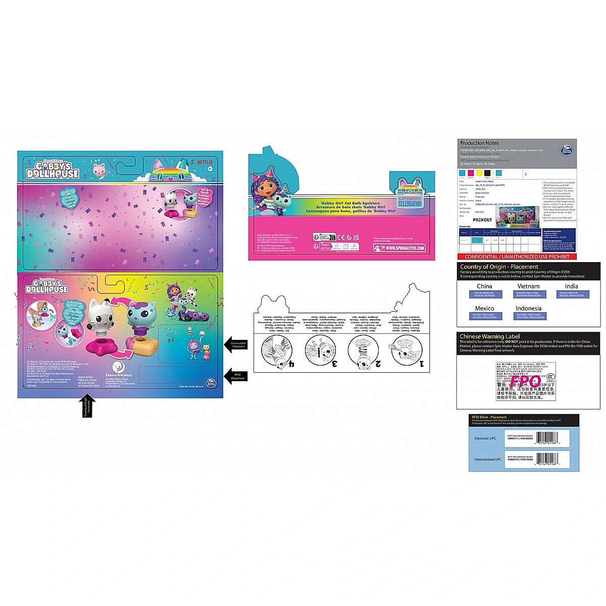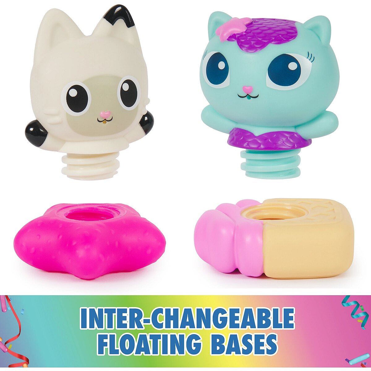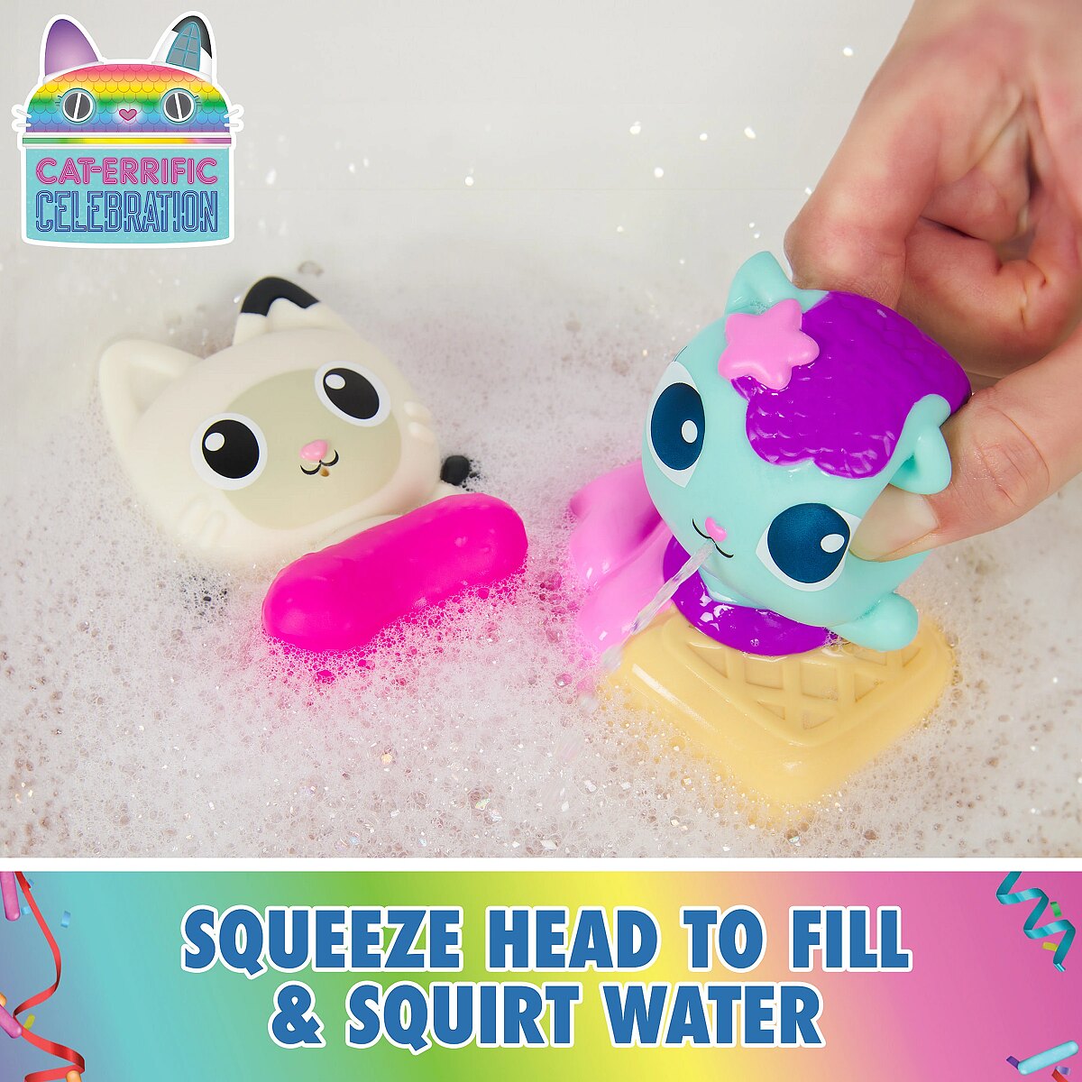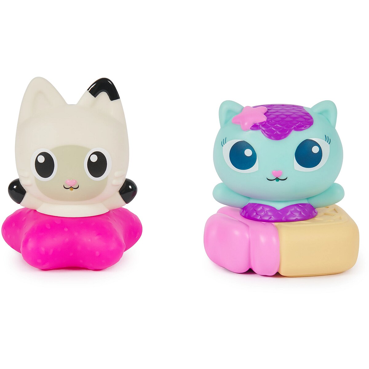 LongDesc - Elevate bath time fun with the Gabby Cat Bath Squirters Bath Set! This delightful collection features Mercat & Pandy Paws bath toys that both squirt & float upright in the tub! Squeeze Mercat & Pandy to squirt water and even interchange their floaters. For even more fun in the tub, look for the Gabby & SS Mercat Bath Set to include Gabby and a floating cruise ship toy in the fun! (Sold Separately) Gabby’s Dollhouse toys for girls & boys are great gifts for kids who are fans of the hit Netflix series and enjoy building pretend play doll house worlds. Make their entry into dollhouse play memorable with a world of lovable toy figures, dollhouse accessories and dollhouse furniture to collect and configure! Build your world with house kit essentials like a play kitchen or a music room, and tons of items to collect, like an awesome cruise ship toy, a mermaid themed pool and the all-new Party Room Playset - dollhouse attic with an indoor skate park, and super cute dollhouse balconies with mini fidget toys, that provide satisfying sensory play, and work seamlessly with both versions of the dollhouse!Includes: 1 Mercat Bath Squirter, 1 Pandy Paws Bath Squirter, 2 Bases