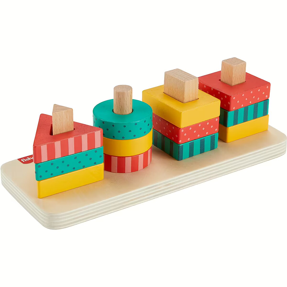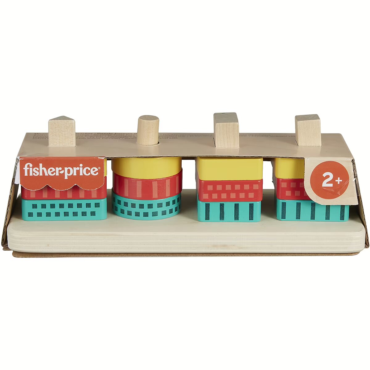 LongDesc - The Wooden Shape Stacker from Fisher-Price features colourful wooden triangles, circles, rectangles and squares for toddlers to sort and stack on to the base. Made with wood from Forest Stewardship Council-certified sources (FSC-N004566) and decorated with non-toxic, water-based paints, this stacking toy helps foster fine motor activities and introduces colours, shapes, counting and more. Colours and decorations may vary.