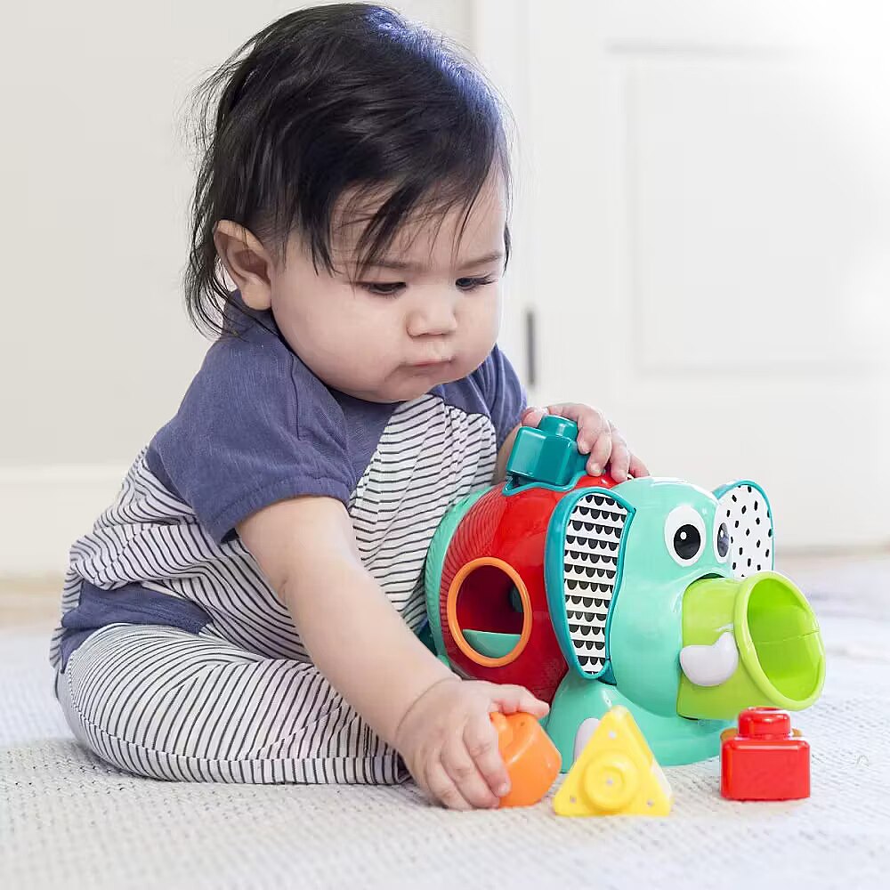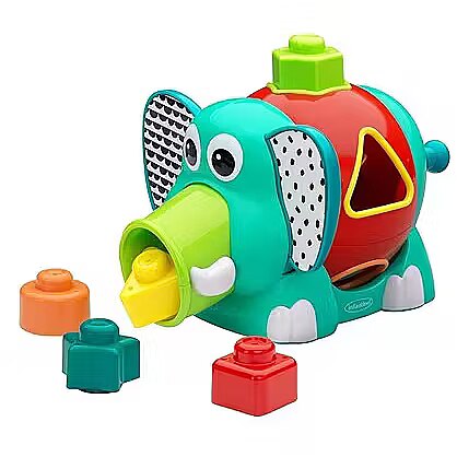 Description - INFANTINO SORTER WITH BLOCKS ELEPHANT Sorter with blocks of different shapes and colours. The blocks can be thrown through the corresponding holes in the sorter. After pressing on the ears, the elephant will throw the blocks through the trunk. The sorter can be turned and the blocks can be mixed by spinning the elephant's tail. Includes 5 blocks in different shapes (triangle, square, circle, star, hexagon).