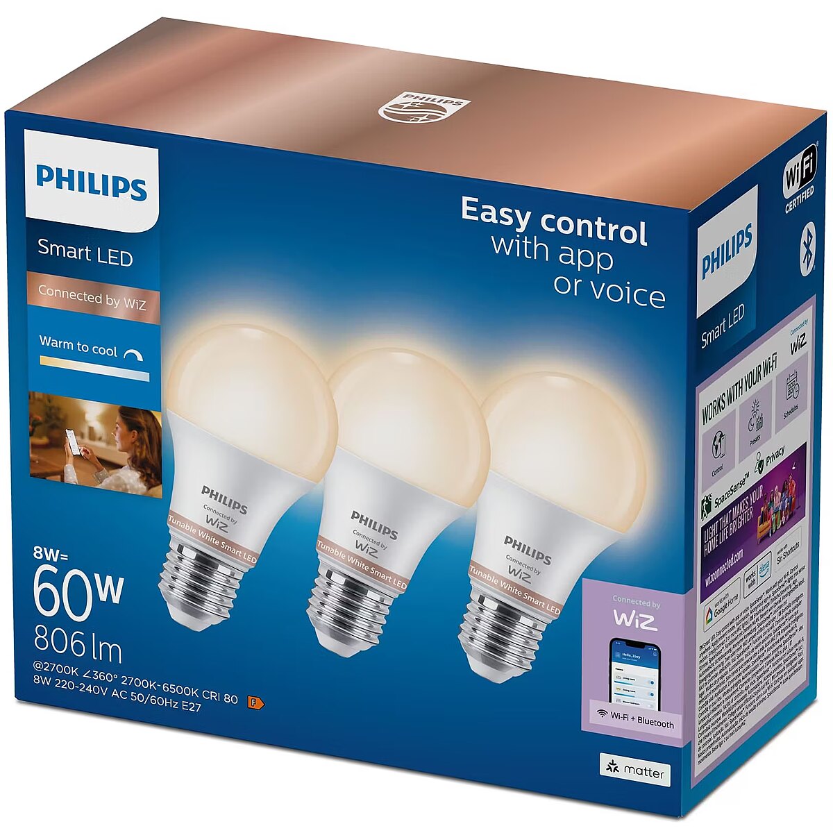 LongSummaryDescription - Philips Bulb 60 W A60 E27 x3. Type: Smart bulb, Interface: Wi-Fi/Bluetooth, Product colour: White. Energy efficiency class: F, Input voltage: 220-240 V, AC input frequency: 50-60 Hz. Width: 60 mm, Depth: 111 mm, Height: 111 mm. Package width: 180 mm, Package depth: 85 mm, Package height: 155 mm. Quantity per pack: 3 pc(s)