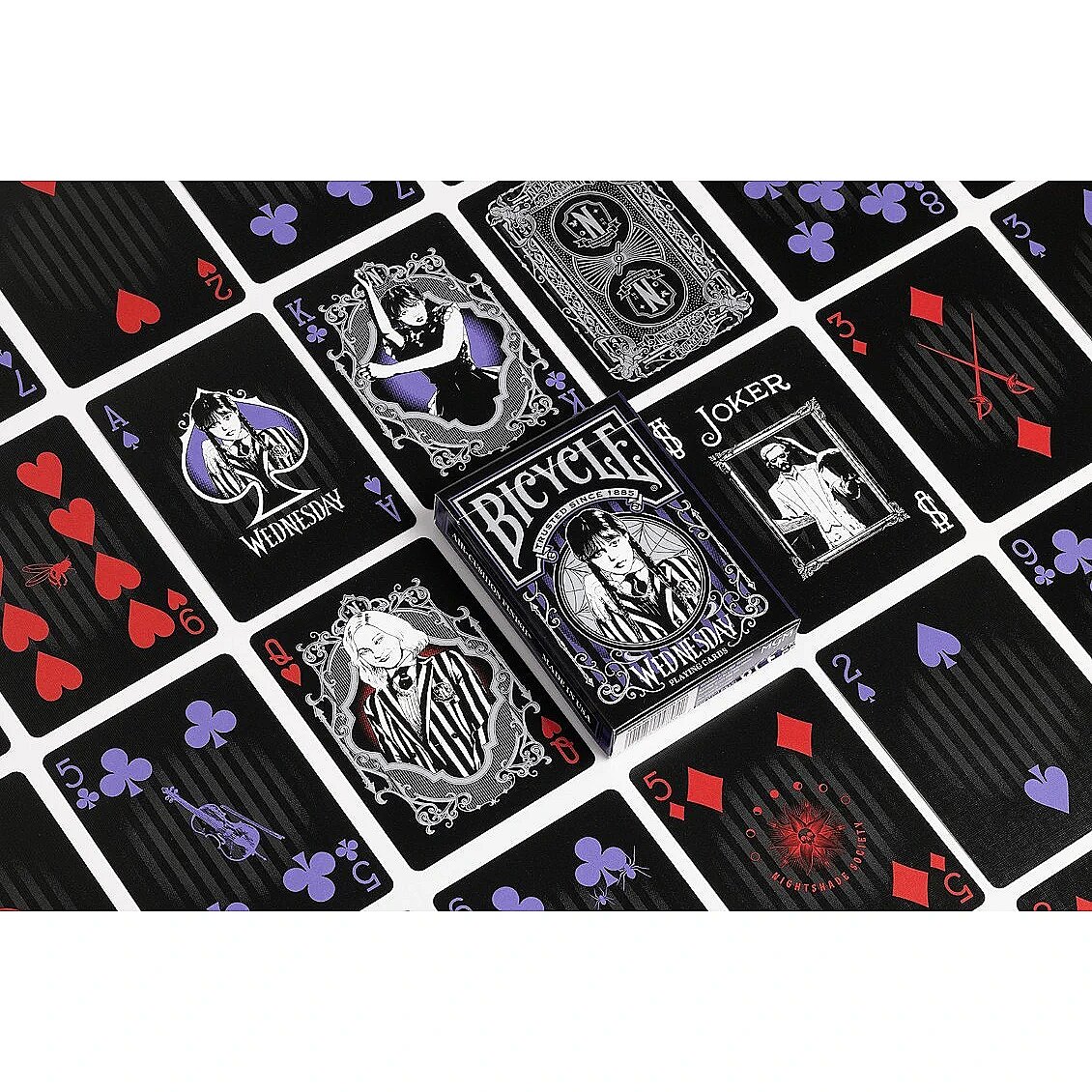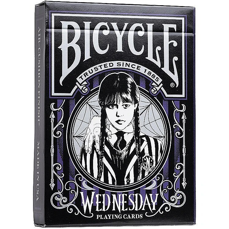Description - Wkrocz do mrocznego świata Akademii Nevermore z Bicycle Wednesday! Zainspirowana hitowym serialem Netflixa z Jenną Ortegą w roli Wednesday Addams; Twoja następna gra karciana to pełen emocji taniec z makabrą, gdy tasujesz atramentowo-czarne karty z ulubionymi przez fanów postaciami z serialu.