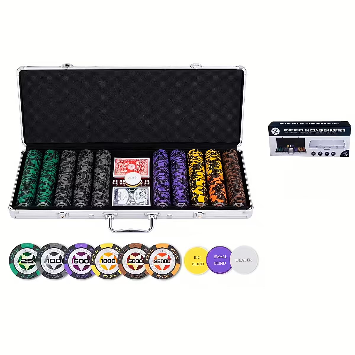 Podział żetonów: 100x 25 dla strategicznych zagrań. 150x 100 idealne do podkręcenia rywalizacji. 100x 500 dla średnich i wysokich zakładów. 75x 1000 dla odważnych ruchów. 50x 5000 wprowadź emocje na najwyższym poziomie. 25x 25000 dla prawdziwych pokerowych mistrzów. Zawartość zestawu: Dwie talie kart, idealne do rozgrywek w pokera. Trzy przyciski rozdającego (dealer buttons). Pięć kostek do gry. Elegancka walizka zamykana na kluczyk, zapewniająca bezpieczeństwo zawartości. Zestaw idealnie sprawdzi się podczas domowych turniejów pokerowych, spotkań ze znajomymi oraz jako wyjątkowy prezent dla pasjonatów pokera. Zaprojektowany tak, aby każdy gracz poczuł się jak w profesjonalnym kasynie.