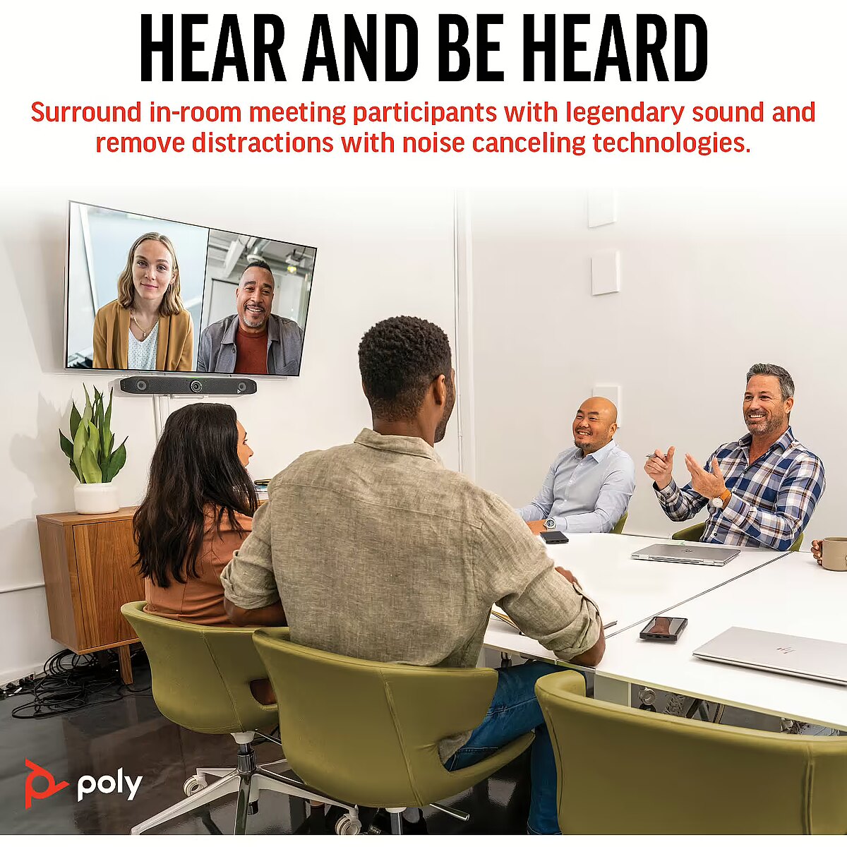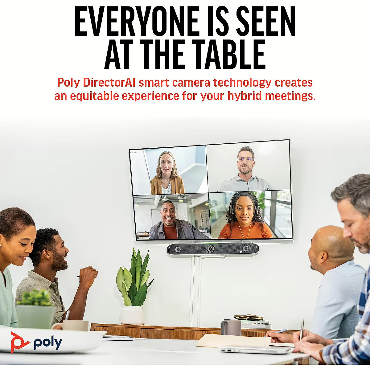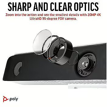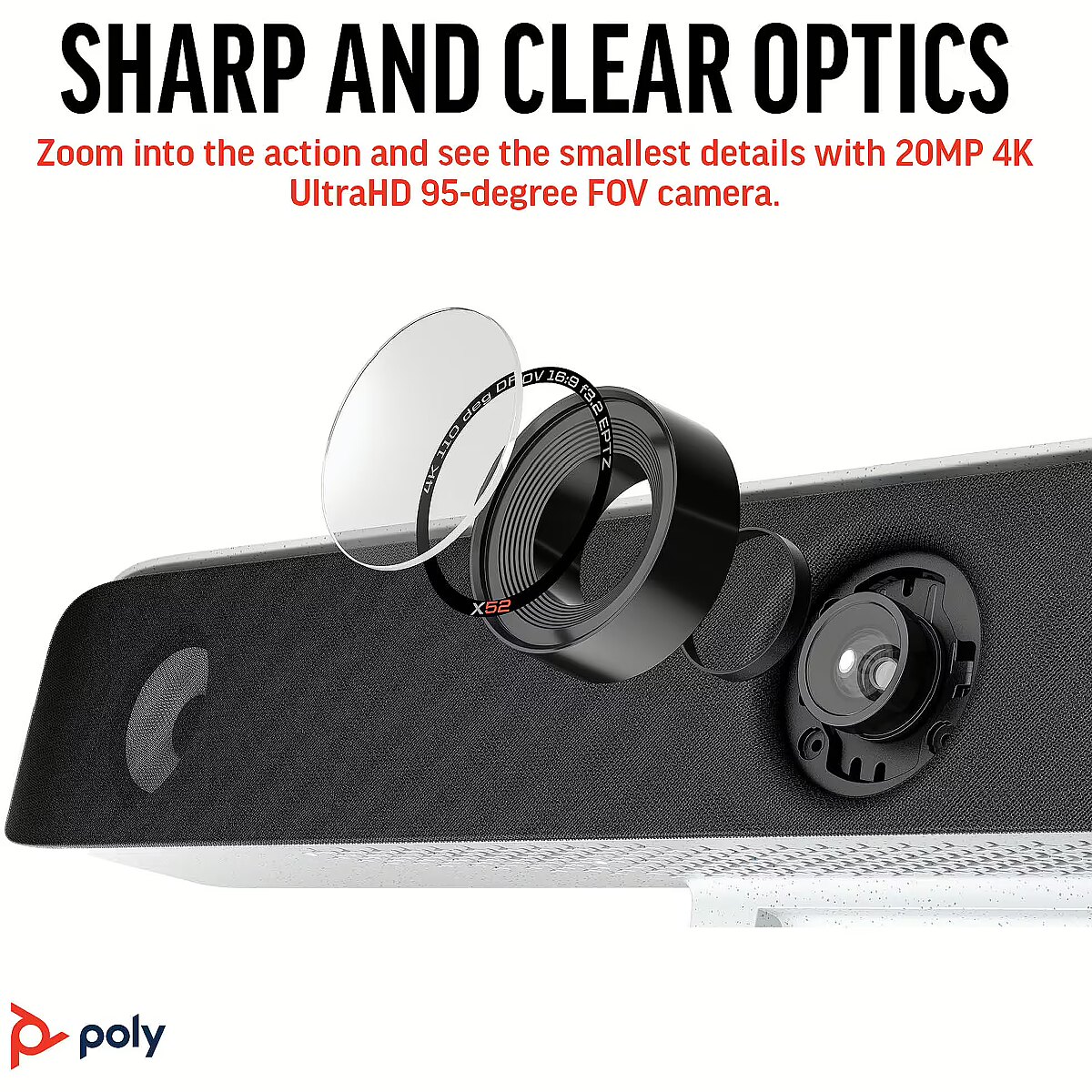 Description - Poly Studio X52 universal video strip (8D8K2AA) Dramatically streamline your meetings Designed specifically to improve the video conferencing experience, the Poly Studio X52 universal video bar simplifies and improves your meetings. Bring meeting parity to participants both in and out of the room with innovative audio and video experiences Choose how you want to join the conversation Give users the flexibility they need to join any cloud video call using built-in applications, standards-based protocols, or using personal devices connected to the room system. Corporate level management Poly Lens, remote device management, provides greater visibility into workspaces across the organization. IT professionals can remotely monitor and troubleshoot Poly devices and improve mass application of software and policies. Everyone can be seen and heard Give everyone equal representation on the call with Poly's innovative audio and video blending technologies, which include precise, automatic framing powered by artificial intelligence and intelligent audio filtering. Sharp and clear optics Zoom in and see the finest details with the 20MP 4K UltraHD camera with a 95-degree field of view, carefully designed for medium-sized spaces. Always present in the best light in spaces with sharp, clear optics, true colors and low light compensation. Everyone is seen at the table Encourage engagement in meetings with intelligent video features that help remote participants feel connected. Poly DirectorAI smart camera technology ensures a fair experience in hybrid meetings. Get going in minutes Medium-sized rooms can be up and running in minutes thanks to its simple setup and all-in-one design. And with a powerful camera, microphones, speakers, and built-in cloud video apps, you'll have everything you need to power your meeting spaces. Listen and be heard Surround meeting participants with rich and immersive sound from the built-in stereo speakers. Clearly pick up voices from across the table and remove distractions from your meeting with Poly NoiseBlockAI and Acoustic Fence technologies. Join however you want Connect to almost any cloud video service using built-in cloud video applications. Use the Poly Video app to connect to cloud video services via H.323 and SIP, or connect to any cloud video platform from your PC by connecting via USB. Easy management with Poly Lens Take control of your deployment from anywhere through remote management with Poly Lens cloud-based device management software.