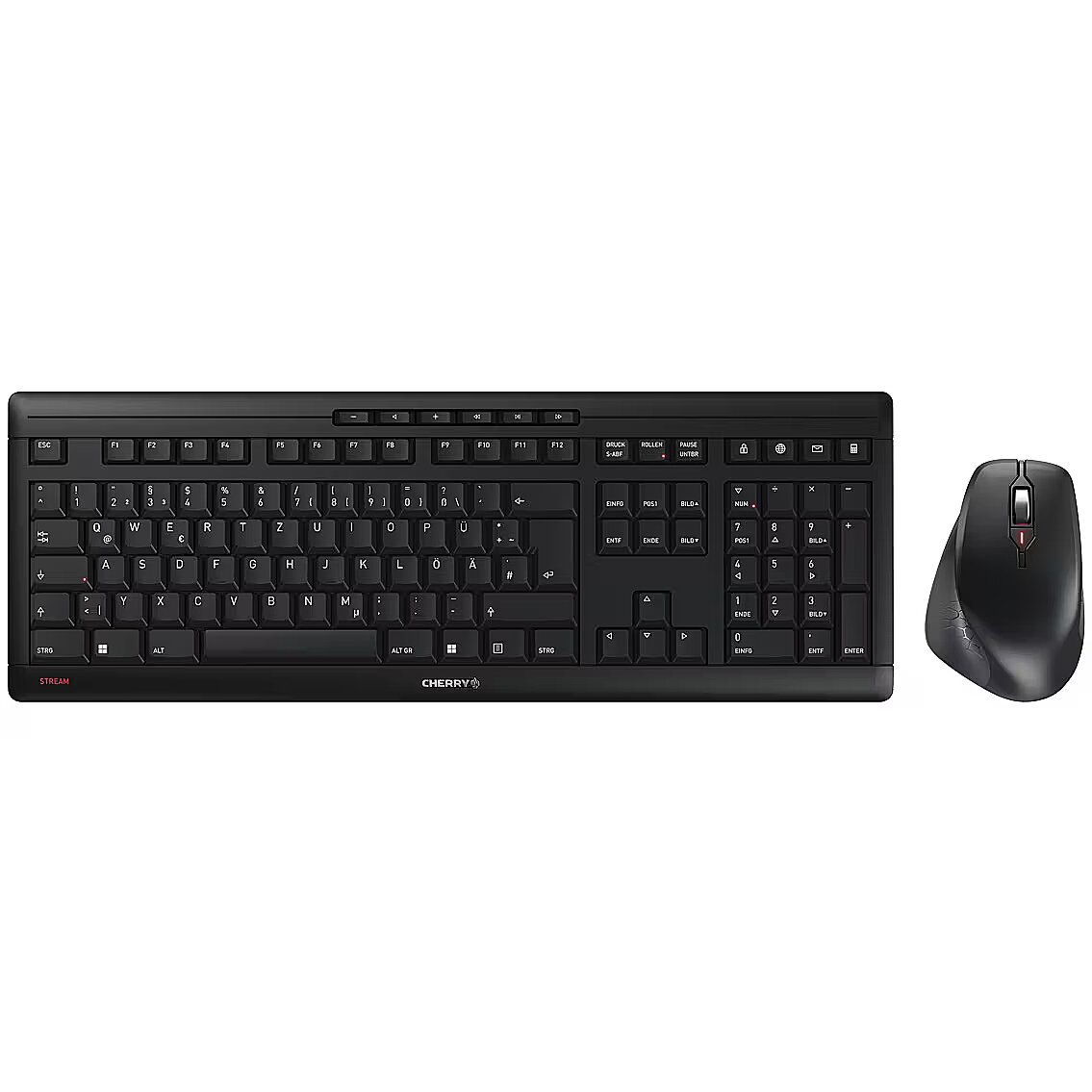 LongSummaryDescription - CHERRY STREAM DESKTOP COMFORT. Keyboard form factor: Full-size (100%). Keyboard style: Straight. Connectivity technology: Wireless, Device interface: RF Wireless, Keyboard key switch: Scissor key switch, Keyboard layout: QWERTZ, Keyboard number of keys: 114, Recommended usage: Home/Office. Product colour: Black. Mouse included