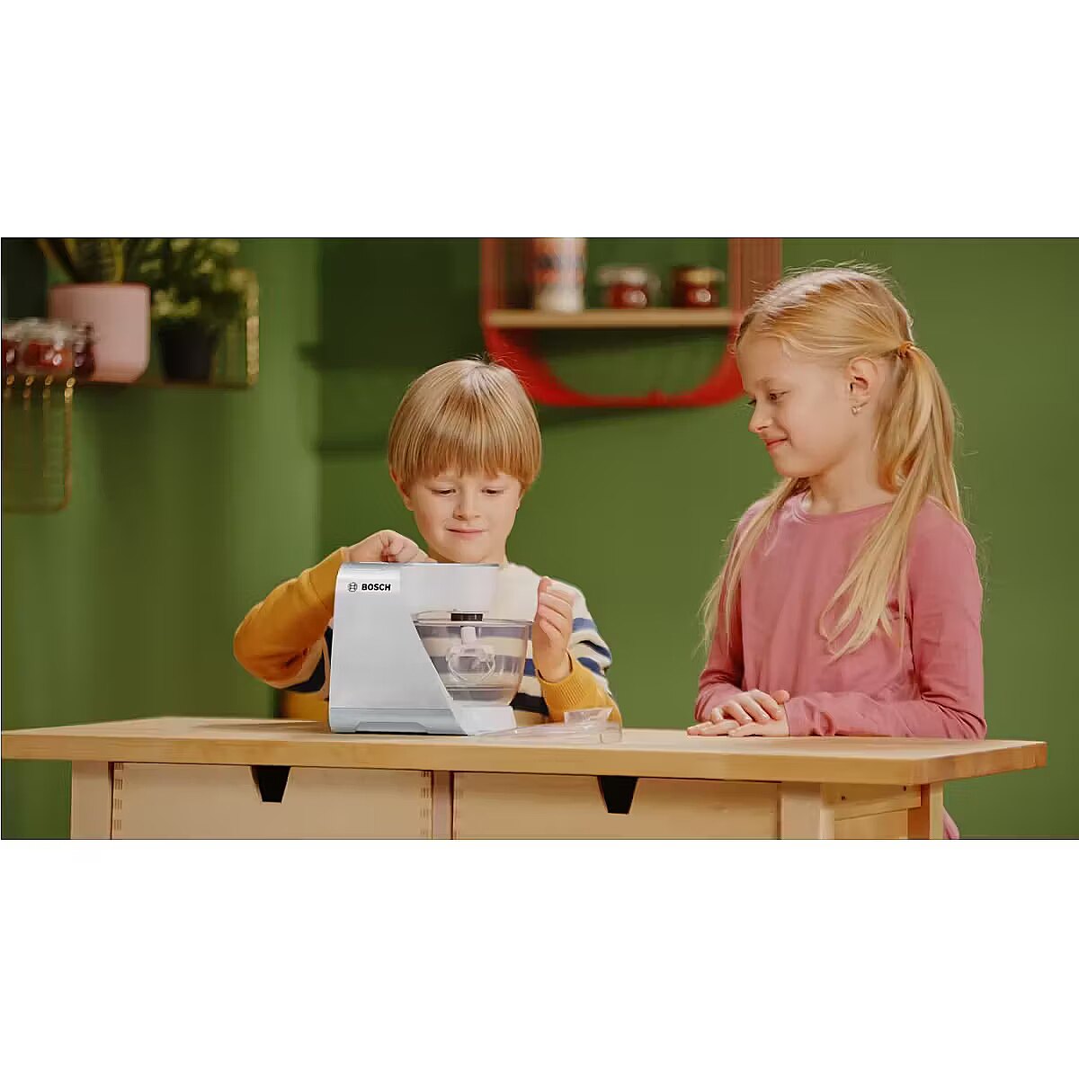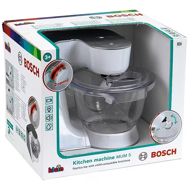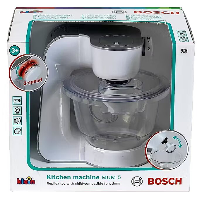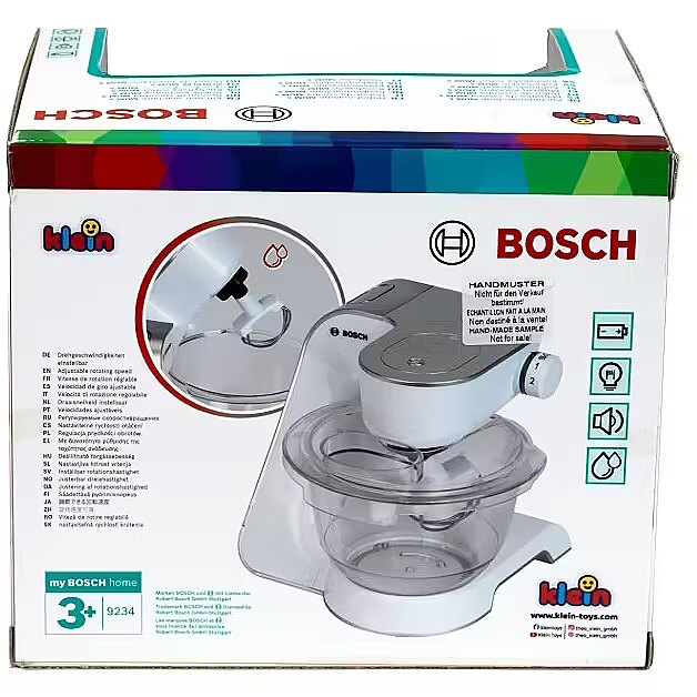 Description - KL 9234 Robot kuchenny Bosch Srebrny Robot kuchenny Klein powstał na licencji Bosch, dlatego też są wierną kopią prawdziwego urządzenia produkowanego przez tę firmę. Firma Klein od lat produkuje odpowiedniki prawdziwych narzędzi i akcesoriów AGD, przeznaczone do zabawy dla najmłodszych. Robot kuchenny jest srebrny i idealnie nada się do każdej dziecięcej kuchni, a także zapewni ciekawe urozmaicanie każdej zabawy. Zabawka została wyposażony w zdejmowaną przezroczystą miskę, składane ramię, dwie regulowane prędkości obrotów, funkcję światła i dźwięku. Dla właściwego użytkowania zabawki wymagane są baterie, które nie są częścią zestawu. Ten zabawkowy robot kuchenny może naprawdę służyć do przygotowania prostego deseru, czy koktajlu. Misa na produkty jak i mieszadło są wyjmowane dzięki czemu z łatwością można je umyć. Panel, w którym mocuje się mieszadło, podnosi się do góry, aby bez usuwania mieszadła można było wyjąć misę, aby np. dodać do niej produkty. Podczas pracy urządzenia na panelu ustawień zapalają się lampki kontrolne, co jeszcze bardziej zbliża tą zabawkę wyglądem do prawdziwego robota kuchennego. Jest to jedna z najbardziej realistycznych, zabawkowych imitacji sprzętów AGD firmy Klein. Zabawka zachwyci każdą dziewczynkę, która uwielbia obserwować i pomagać swoim opiekunom w kuchni. Wygląd i funkcje robota kuchennego są bardzo podobne do oryginalnego produktu marki Bosch, ale dzięki jego plastikowym elementom jest zupełnie bezpieczny w użytkowaniu. Wielkość robota jest dopasowana do potrzeb i rączek dziecka. Zabawka z pewnością będzie również świetnym uzupełnieniem pozostałych zestawów kuchennych firmy Klein. Specyfikacja: Produkt jest zabawką Zabawka przeznaczona dla dzieci powyżej 3 roku życia Waga : 0,64 kg Wymiary opakowania : 20x22x20 cm Wymagane baterie: 3 x AA Ilość w opakowaniu zbiorczym : 4 Kraj pochodzenia : Chiny Seria zabawek AGD firmy KLEIN realistycznie odzwierciedla prawdziwe urządzenia wprowadzone na rynek przez najbardziej znane i jakościowo najlepsze marki produktów. Dla małych gospodyń domowych to niesamowita atrakcja! Dzieci z chęcią uczą się pomagać w wykonywaniu domowych czynności jednocześnie świetnie się przy tym bawiąc. Każdy ze sprzętów kuchennych pomoże w przygotowaniu zarówno małej przekąski jak i wykwintnego przyjęcia dla lalek lub koleżanek. Dodatkową zaletą tych zabawek jest to, że ich kolorystyka jest odpowiednia dla dziewczynek oraz dla chłopców.