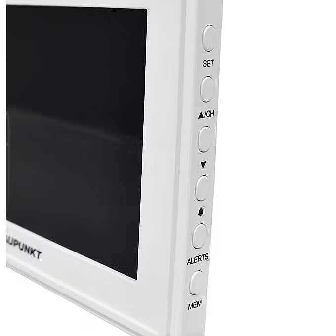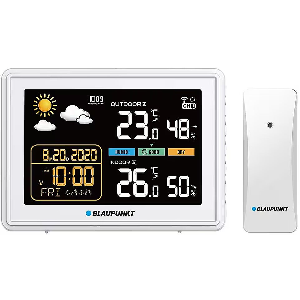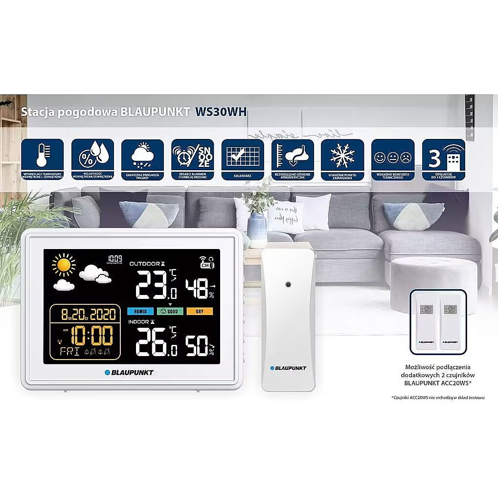 Description - WS30WH weather station Weather station with internal and external temperature and humidity measurement, absolute atmospheric pressure reading, temperature and humidity trend indicator, clock and calendar and alarm function, as well as support for up to three wireless sensors. Regardless of the season, take care of your thermal comfort! The BLAUPUNKT WS30BK weather station will help you with this, as it will display the temperature and humidity both indoors and outdoors. It will tell you whether your living room is too dry, too humid, or whether it is just right! In addition, you will find out the current atmospheric pressure and the weather forecast for the next day. A clock with an alarm and calendar will also come in handy in your everyday life. Thermometer and hygrometer always at hand! WS30BK has a built-in sensor to measure temperature and humidity inside the room where it is installed. The additional wireless sensor included in the set can perform measurements outdoors or in any selected location. Data regarding both temperature and humidity measurements are constantly updated and displayed on the LCD display built into the weather station*. Additionally, the device has a memory for measuring the lowest and highest values of both temperature and humidity, which reset automatically at the beginning of the next day. Temperature values can be displayed in either degrees Celsius or degrees Farenheit. Get to know the trends in your environment, including weather trends. In addition to reading temperature and humidity, trend indicators for these parameters are available. The arrows appearing on the screen indicate how the measured values have changed over the last hour. An up arrow means that a given parameter has increased its value, a down arrow indicates a decrease in the value of a given parameter, and a horizontal arrow means that a given value has not changed. You don't have to wait for the weather forecast, just take a look at our station! The display of the WS30BK weather station also provides a graphical weather forecast for the next 12-24 hours. Please note that this forecast is calculated based on temperature and humidity fluctuations and has limited accuracy, but it is a useful tool for estimating weather conditions for the next few hours in a specific location. Depending on the prevailing conditions, pictograms are available predicting sunny, partly cloudy, cloudy, rainy or snowy weather. The blood pressure is dropping, time for a cup of coffee! The WS30BK weather station has a built-in sensor for measuring absolute atmospheric pressure, and the reading data appears on the display. If you feel a sudden drop in energy or you are a meteorologist, just look at the display and if your blood pressure is low, it's a sign that you need to prepare a cup of coffee. Please note that this weather station reads absolute atmospheric pressure, which may differ from that reported in official weather forecasts. The reason for this difference is that the relative pressure given in official weather forecasts is reduced to sea level. The absolute pressure indicated in this model is the pressure measured at a given location at the appropriate height. Turn up the parameters! The WS30BK weather station has been carefully calibrated in our manufacturing facility, but if for any reason you wish to adjust the measurement values to your needs, you can manually calibrate the internal temperature, internal humidity and pressure values. The temperature calibration range is +/- 5 degrees, humidity +/- 10% and pressure +/- 9 hPa. When setting up the weather station, you can also manually adjust the appropriate weather forecast pictograms. What time is it, what day is it? There is also a clock on the LCD screen that can display the current time in both 12- and 24-hour formats. Thanks to this, the station also functions as a useful watch. Next to the clock, there is also a calendar that will inform you what day of the month it is and what day of the week it is. The names of the days of the week are available in seven languages (DE, EN, FR, IT, SP, DU and DA) and can be changed when setting the calendar. Hello! Incentive! The WS30BK weather station also has an alarm function, so if you need to get up earlier, simply set the time you want the alarm to go off and sleep soundly. The alarm will go off automatically, and if you want to sleep a little longer, turn on the snooze function and the alarm will go off again in 5 minutes. The alarm is triggered by a sound signal that lasts for 2 minutes, long enough to wake up even the heaviest sleepyhead. Additionally, you can set different wake-up times on weekdays and on weekends. You can also use the alarm not only to wake up, but also as a reminder of some important events a day you don't want to miss. LCD display! are you going dark? Of course I'm missing the point. The WS30BK weather station is equipped with a high-quality color LCD display that has a dimming function and no, it does not cheat, it only changes the brightness of the backlight and, importantly, it does not do it itself. You decide when to dim the display to make it less distracting or more visible. Will I need to scrape the car windows? You'll know the answer to this question before you leave home because the WS30BK weather station also has a freezing point indicator. When the measured external temperature reaches the low limit value of 3°C, the device will emit a sound signal and an appropriate graphic symbol will appear on the display. When the temperature increases, the freezing point indicator will turn off automatically. Measurements from one sensor not enough? No problem. The station supports up to three external sensors, so you can buy two additional optional Blaupunkt ACC20WS sensors for the sensor included in the set, set them on the appropriate channels (the sensors have 3 channels, switched manually), so that the signals do not interfere with each other and apply them where