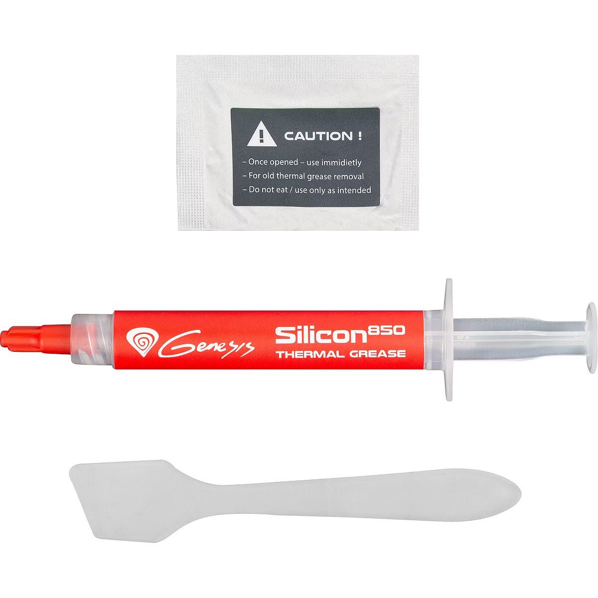 Description - SILICON 850 Genesis Silicon 850 is an extremely efficient thermal grease that will meet the high expectations of users looking for uncompromising solutions. THERMAL CONDUCTIVITY= 13,4W/mK Very high thermal conductivity will allow use of full potential that cooler provides. EASY APPLICATION Silicon 850 is not only paste, but also additional equipment. The set includes an easy-to-apply spatula and an alcohol-soaked cloth that will quickly and conveniently deal with the residue of previously applied paste.