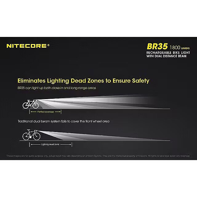 Description - Nitecore BR35 Dual Distance beam allows for both near and far illumination Preset lighting modes for city, roads and trails Remote switch extends the mode switch function to the handlebar OLED screen displays current mode, brightness levels, remaining runtime and battery power Micro USB rechargeable with built-in protection from overcharge, over-discharge and automatic charging termination upon completion Built-in 6800mAh Li-ion battery with runtime up to 17 hours No tools needed mount with quick-release for fast mounting and removal Die-cast unibody construction
