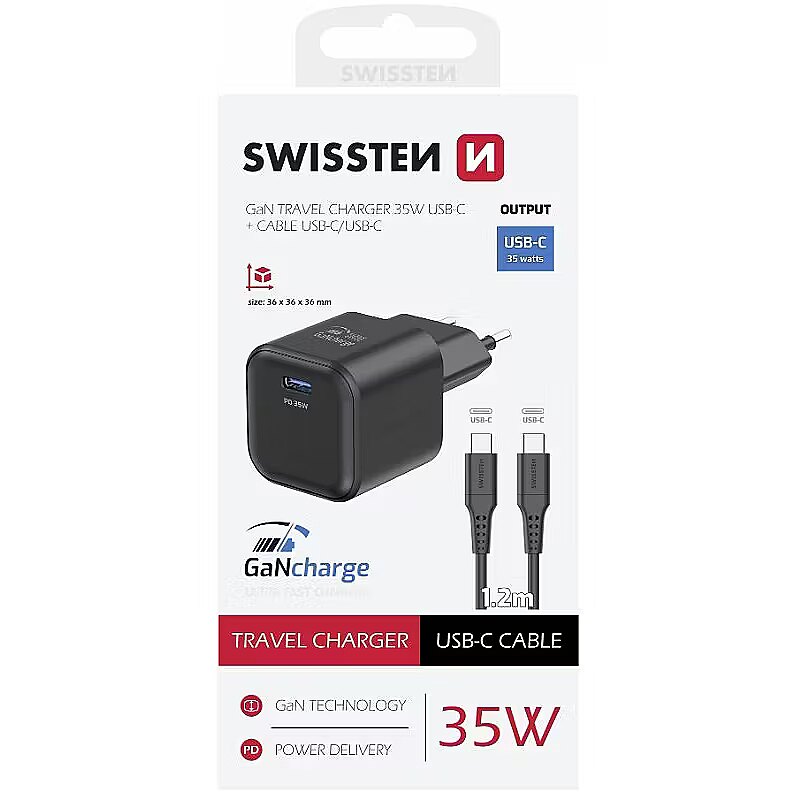 title_en - Swissten Travel Charger GaN USB-C 35W PD + Data Cable USB-C - USB-C 1.2m