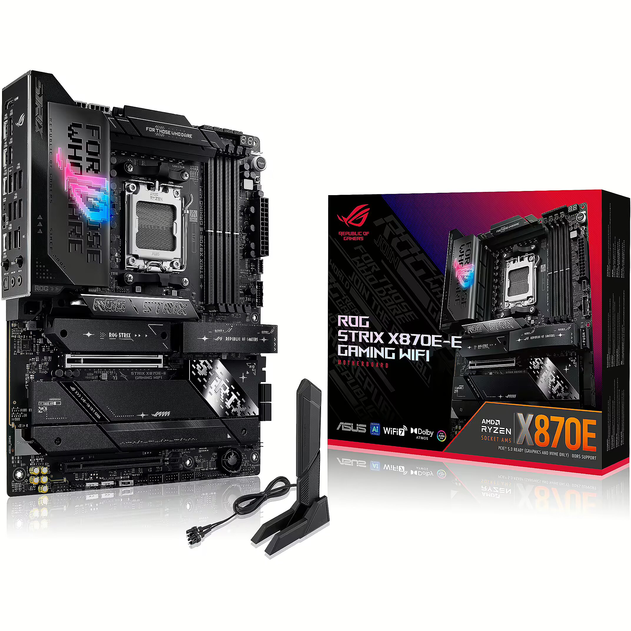 Summary - ASUS ROG STRIX X870E-E GAMING WIFI. Processor manufacturer: AMD, Processor socket: Socket AM5, Supported processor sockets: Socket AM5. Supported memory types: DDR5-SDRAM, Maximum internal memory: 192 GB, Memory slots type: DIMM. Supported storage drive interfaces: M.2, SATA III, Supported storage drive types: HDD & SSD, RAID levels: 0, 1, 10, 5. Ethernet interface type: 5 Gigabit Ethernet, Top Wi-Fi standard: Wi-Fi 7 (802.11be), Wi-Fi standards: Wi-Fi 7 (802.11be). Component for: PC, Motherboard form factor: ATX, Motherboard chipset family: AMD