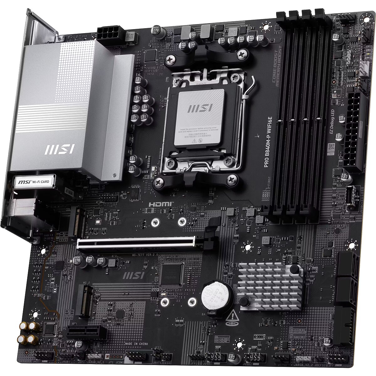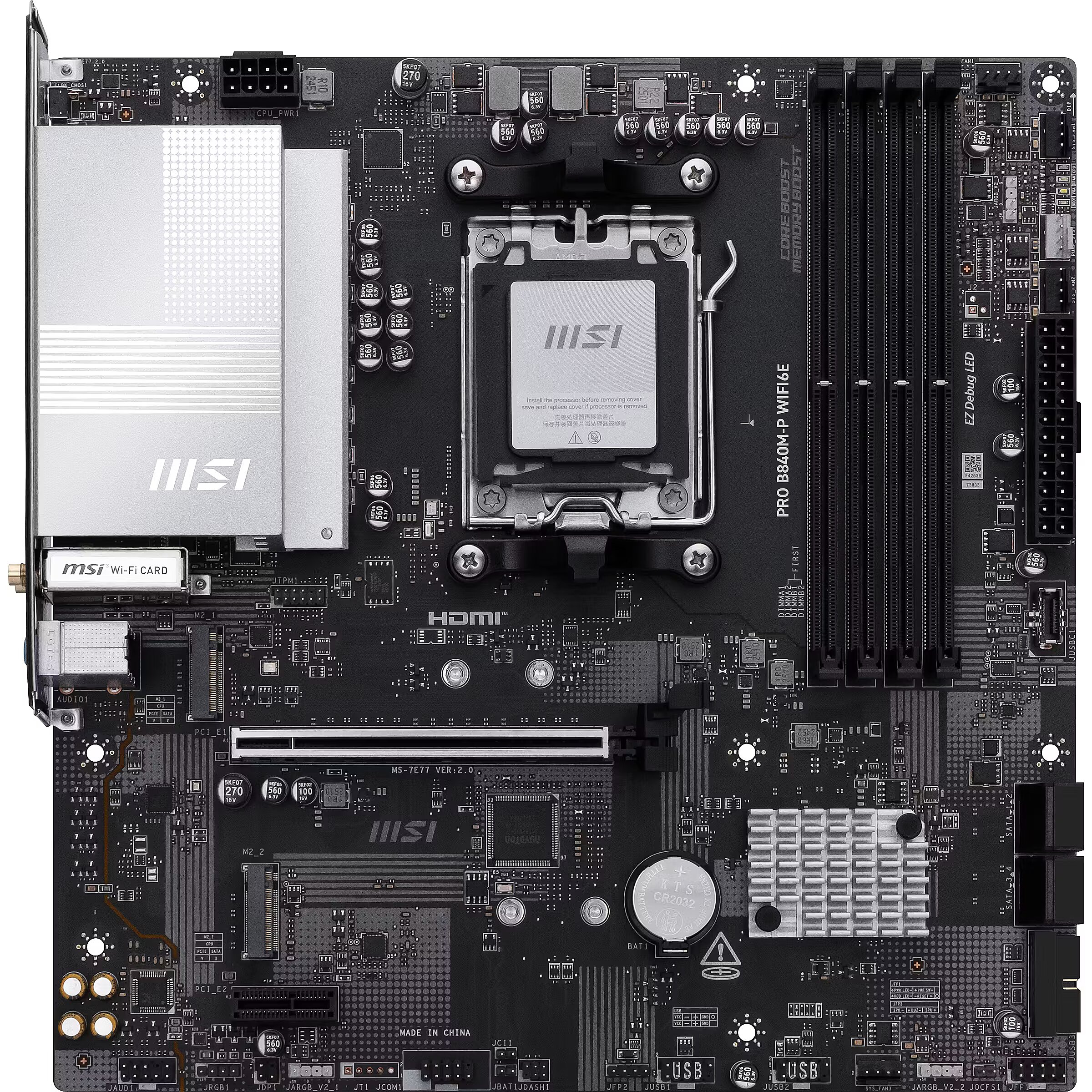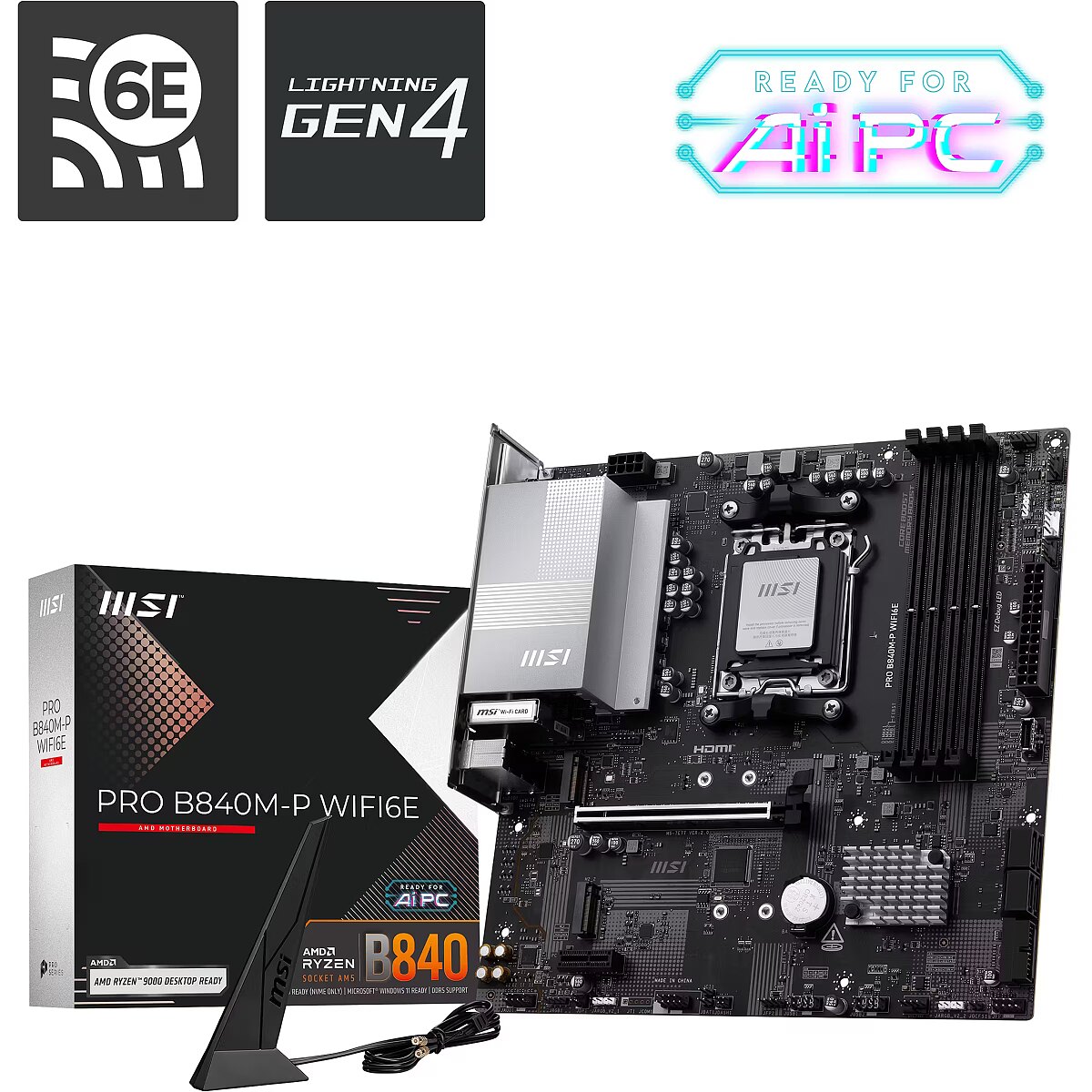 ShortSummaryDescription - MSI PRO B840M-P WIFI6E, AMD, Socket AM5, AMD Ryzen 7000 Series, AMD Ryzen 8000 Series, AMD Ryzen 9000 Series, Socket AM5, DDR5-SDRAM, 256 GB
