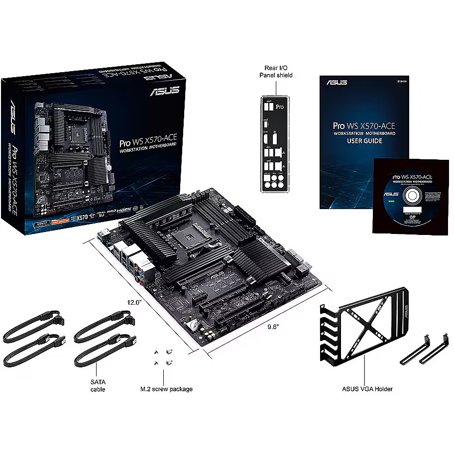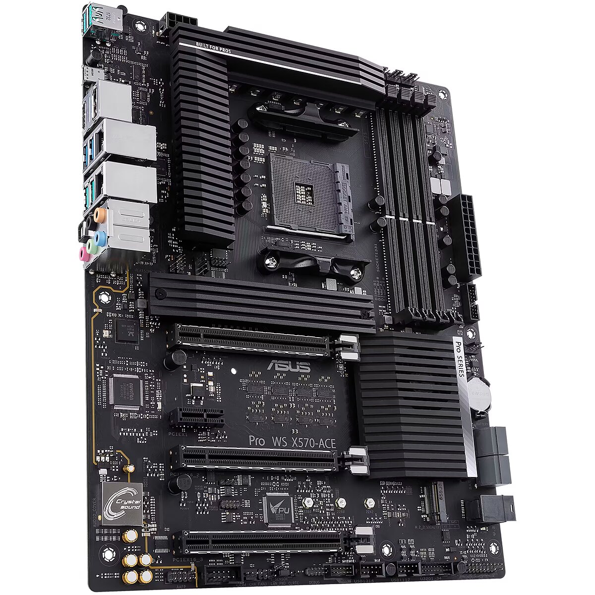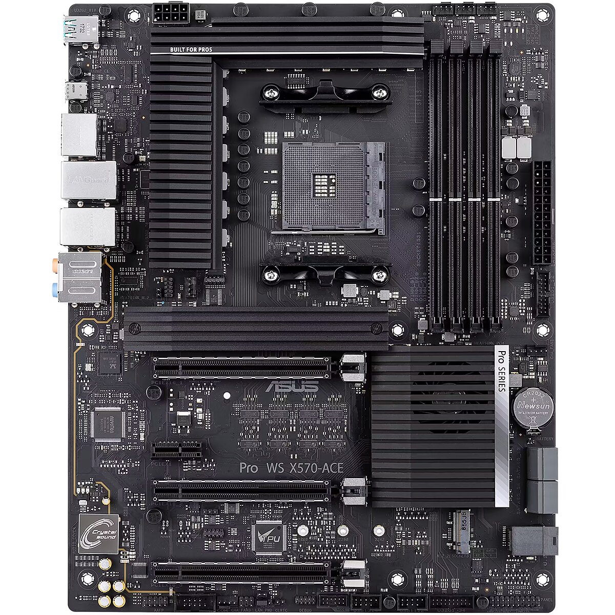 LongDesc - WORKSTATION MOTHERBOARDASUS Pro Workstation motherboards are designed for professionals in AI training, deep learning, animation, 3D rendering or media production. Featuring expandable graphics, extensive storage, impressive connectivity and exceptional overall performance and reliability, Pro Workstation motherboards are the ideal solution for creative professionals. Each motherboard includes centralized management software with support for out-of-band management, so they're also an efficient and cost-effective option for IT administrators.Multi-GPU supportFully loaded takes on new meaning when you have up to 24 PCI Express® lanes and those lanes can be split in a 3-way x8/x8/x8 configuration spanning the board's trio of PCIe x16 slots, allowing you to load up on GPUs to accelerate an increasingly diverse array of workloads, including AI training, 3D rendering, and scientific or financial modeling.ASUS 2-WAY VGA holderUser-friendly designThe Pro WS X570-ACE is packed with an exclusive two-way VGA holder to provide extra rigid support for up to two high-end graphics cards, to prevent potentially damaging bowing or bending. This VGA holder is easy to install and can be mounted with an additional system fan (up to 120mm), making sure your workstation has ample cooling to complete any task.ASUS Control Center ExpressCentralized, cost-effective server-grade managementASUS Control Center Express is centralized server-grade software that works in conjunction with a GbE LAN controller which also serves as a management controller to reduce IT operational costs and improves efficiency. Its out-of-band management enables hardware-level control such as remote hardware reset, BIOS setting and update, and operating system installation across multiple clients, and remotely troubleshoot crashes or unexpected shutdowns.Make your memory faster and reliableError-Correcting-Code (ECC) support offers a potent foundation for your build and enables Pro WS X570-ACE to automatically detect and repair single-bit memory errors, ensuring reliable and responsive performance in mission-critical environments.ASUS OptiMemProprietary Memory DesignASUS OptiMem memory trace layout unleashes the full performance potential of AMD's Infinity Fabric architecture by enabling higher memory frequencies and lower latencies.Power delivery enhancementsThe 3rd Gen AMD Ryzen™ processors boast more cores and bandwidth, demanding more power than typical desktop CPUs. Pro WS X570-ACE is geared up for the demands of these high-core-count processors, offering a stable power to ensure optimal performance.ProCool II power connectorThe latest ProCool II is an enhanced EATX 8-pin power connector that offers higher endurance and longer lifespan by lowering impedance to prevent hotspots and connector failure. The new design includes upgrades to metal amour and solid pins for better dissipation, as well as a warning LED display with a BIOS POST message to indicate an improper connection.Power stages with IR3555 designThe CPU VRM on Pro WS X570-ACE employs a 12+2 power stage design with IR3555, combining high-side and low-side MOSFETs and drivers into a single package, delivering the power and efficiency that high core count processors demand.Alloy chokesThe Pro WS X570-ACE series uses efficient alloy chokes and high-quality thermal pads to help transfer heat from the VRM array to a sink with ample surface area for the processors.Durable capacitorsDurable capacitors are engineered to resist extreme temperatures and provide up to 110% better performance than the industry standard.8-layer PCB designMultiple PCB layers shift heat away from critical components, providing more headroom to push your CPUs beyond stock speeds.Trusted StabilityPro WS X570-ACE features the most comprehensive cooling controls ever, configurable via Fan Xpert 4 or the UEFI BIOS.Active PCH HeatsinkPCIe 4.0 provides twice the bandwidth for data flowing through the chipset, which creates more heat than the previous generation. The Pro WS X570-ACE features an actively cooled heatsink to prevent throttling during sustained transfers.- Custom Delta Superflo Fan: The custom low-noise fan features a high-durability bearing with a 60,000-hour L10 lifespan.- Air Duct: A specially-designed air duct helps the fan generate static pressure and concentrates air flow over the fins.- Finned heatsink: The heatsink fin density is optimized to maximize surface area while maintaining a low-resistance exhaust path.Cooler by designFlexible cooling controlsPro WS X570-ACE features the most comprehensive cooling controls ever, configurable via Fan Xpert 4 or the UEFI BIOS.Multiple temperature sourcesEach header can be set to monitor and react to three thermal sensors, and Fan Xpert 4 allows you to assign a sensor to monitor the temperature of supported ASUS graphics cards — all to provide optimal cooling during GPU- or CPU-intensive workloads.AIO pumpDedicated PWM/DC header for self-contained water-cooling setup, built right in.4-pin PWM/DC fanEach onboard header supports auto-detection of PWM or DC fans.Smart protectionA dedicated integrated circuit protects each fan header from over-temperature and over-current.M.2 HeatsinkKeep your SSD coolerPro WS X570-ACE features an ultra-efficient heatsink to reduce M.2 SSD temperatures by up to 22°C for optimal storage performance and improved SSD longevity.Speed up with onboard M.2 & U.2With x4 PCI Express® 4.0 bandwidth, Pro WS X570-ACE features up to 64Gbps M.2 and U.2 for faster data-transfer speeds — ideal for an operating system or application drive.USB 3.2 Gen 2 back-panel connectorsFuture-proof connectivityThe back panel of the Pro WS X570-ACE features five USB 3.2 Gen 2 connectors, including one reversible Type-C™ and four backward-compatible Type-A to deliver ultimate connection flexibility and blazing data-transfer speeds of up to 10Gbps.Armoury CrateThe new Armoury Crate portal keeps you updated with the latest drivers and 