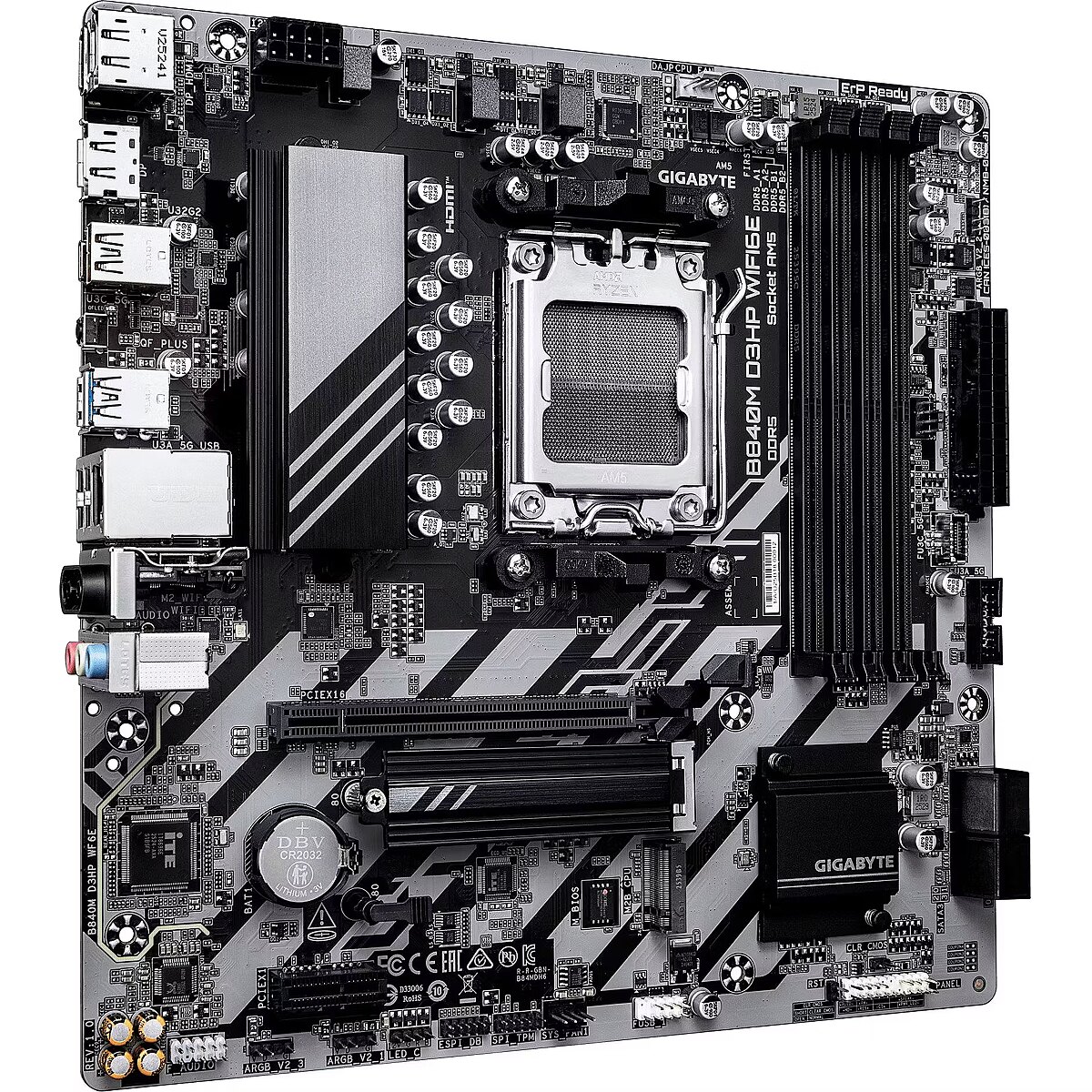 ShortSummaryDescription - GIGABYTE B840M D3HP WIFI6E Motherboard - AMD Ryzen 9000 CPUs, 8+2+2 Phases VRM, up to 8200MHz DDR5(O.C), 2xPCIe 4.0 M.2, Wi-Fi 6E, 1GbE LAN, USB 3.2 Gen 2, AMD, Socket AM5, AMD Ryzen 7000 Series, AMD Ryzen 8000 Series, AMD Ryzen 9000 Series, Socket AM5, DDR5-SDRAM, 256 GB