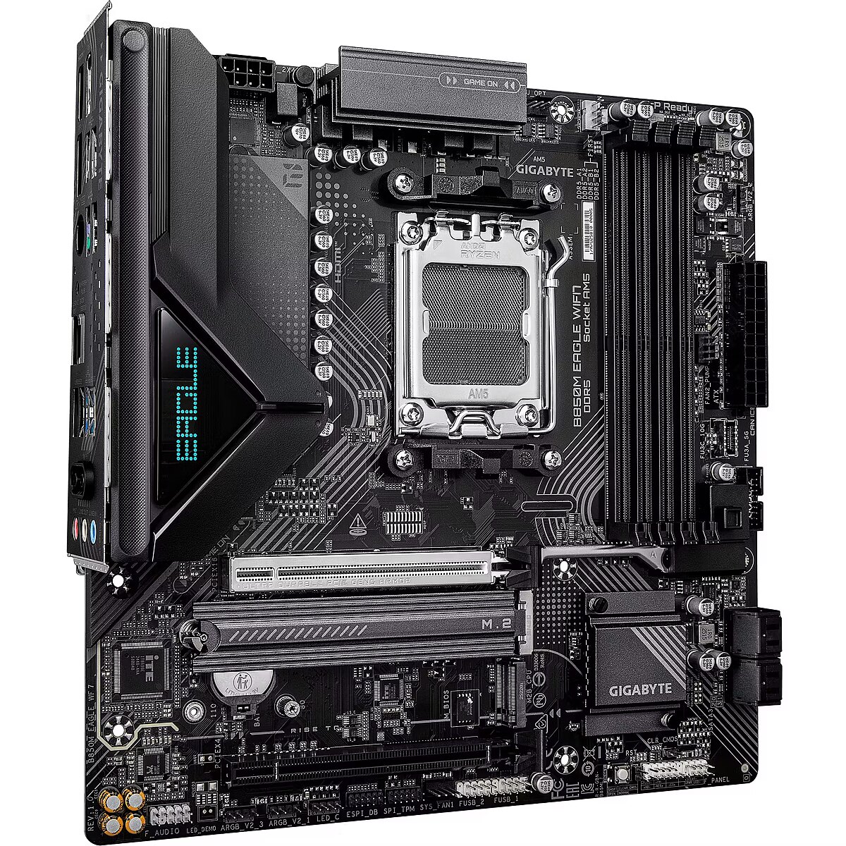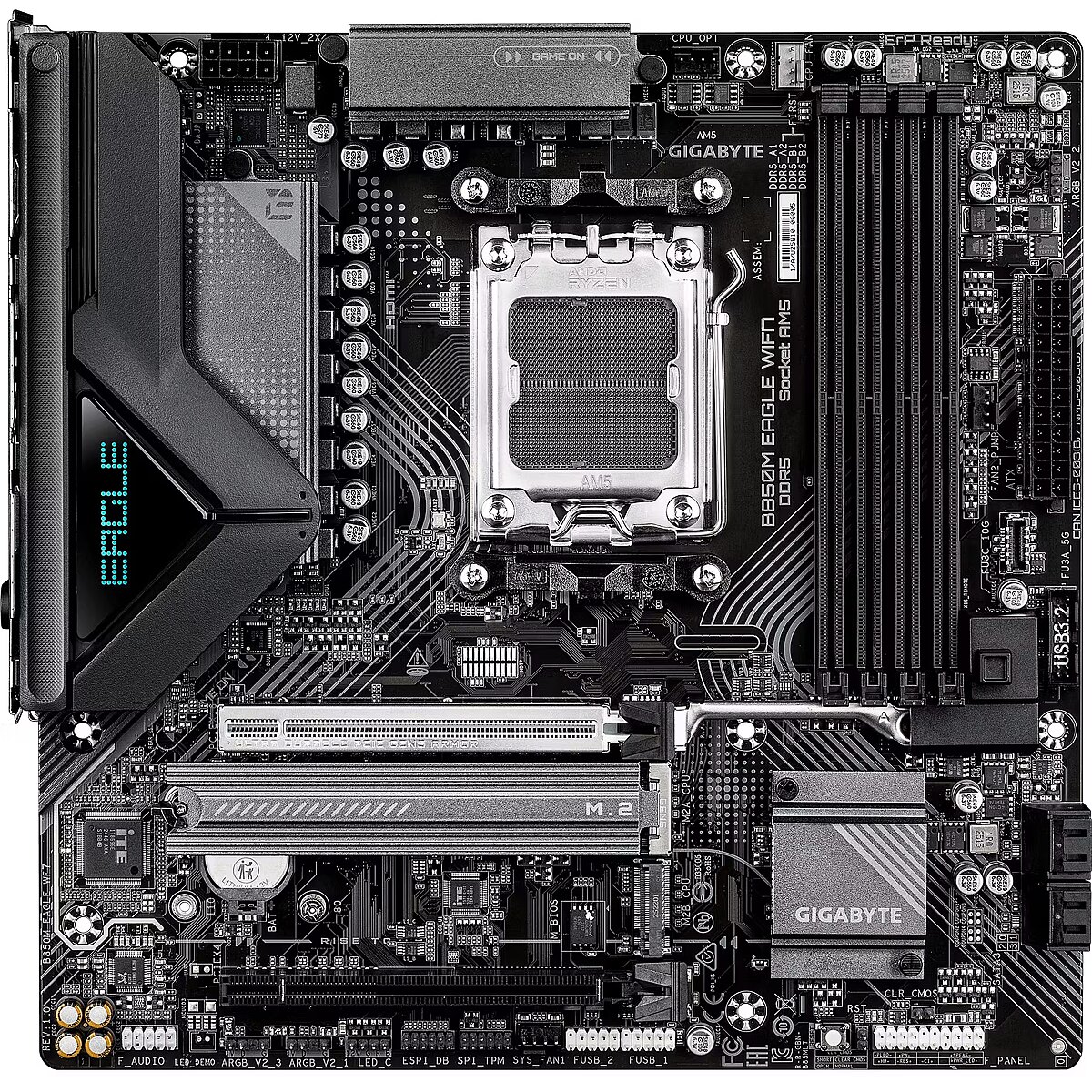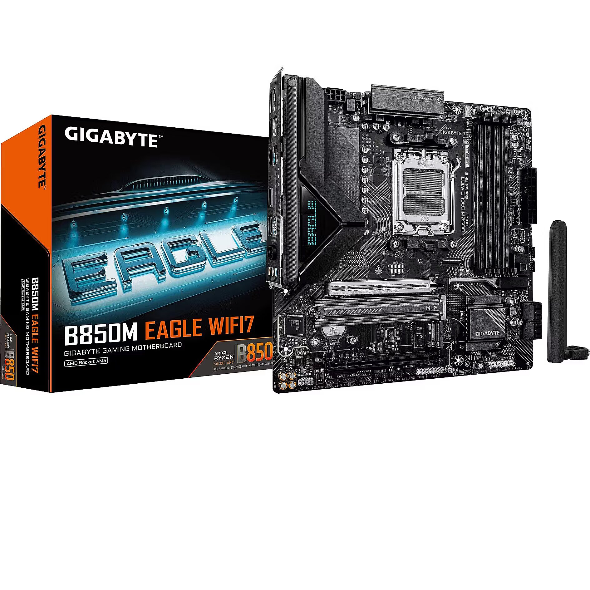 ShortSummaryDescription - GIGABYTE B850M EAGLE WIFI7 Motherboard - AMD Ryzen 9000 Series CPUs, 8+2+2 Phases Digital VRM, up to 8200MHz DDR5 (O.C.), 1xPCIe 5.0 + 1xPCIe 4.0 M.2, WIFI 7, 2.5 GbE LAN, USB 3.2 Gen 2, AMD, Socket AM5, AMD Ryzen 7000 Series, AMD Ryzen 8000 Series, AMD Ryzen 9000 Series, Socket AM5, DDR5-SDRAM, 256 GB