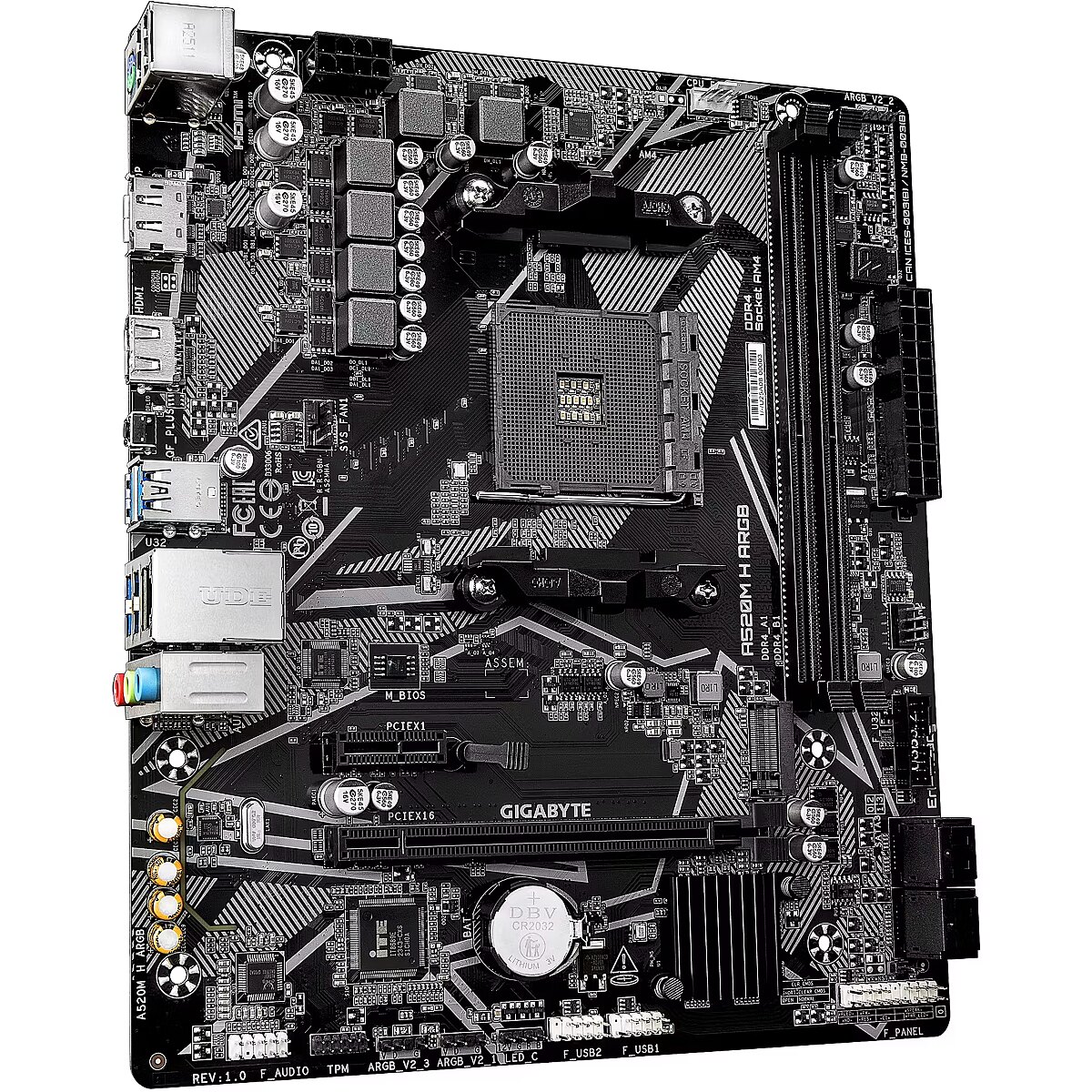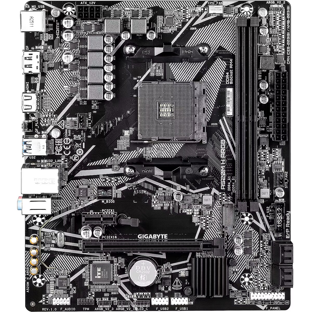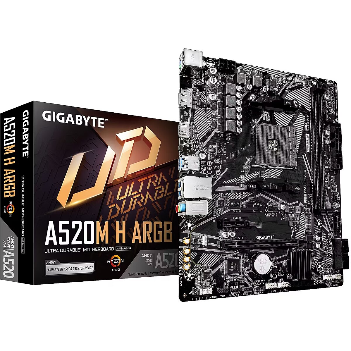 ShortSummaryDescription - GIGABYTE A520M H ARGB Motherboard - Supports AMD Ryzen 5000 Series CPUs, up to 5100MHz DDR4 (OC), PCIe 3.0 x4 M.2, 1 GbE LAN, USB 3.2 Gen 1, AMD, Socket AM4, AMD Ryzen 3000 Series, AMD Ryzen 4000 Series, AMD Ryzen 5000 Series, AMD Ryzen PRO 3000 Series,..., Socket AM4, DDR4-SDRAM, 64 GB