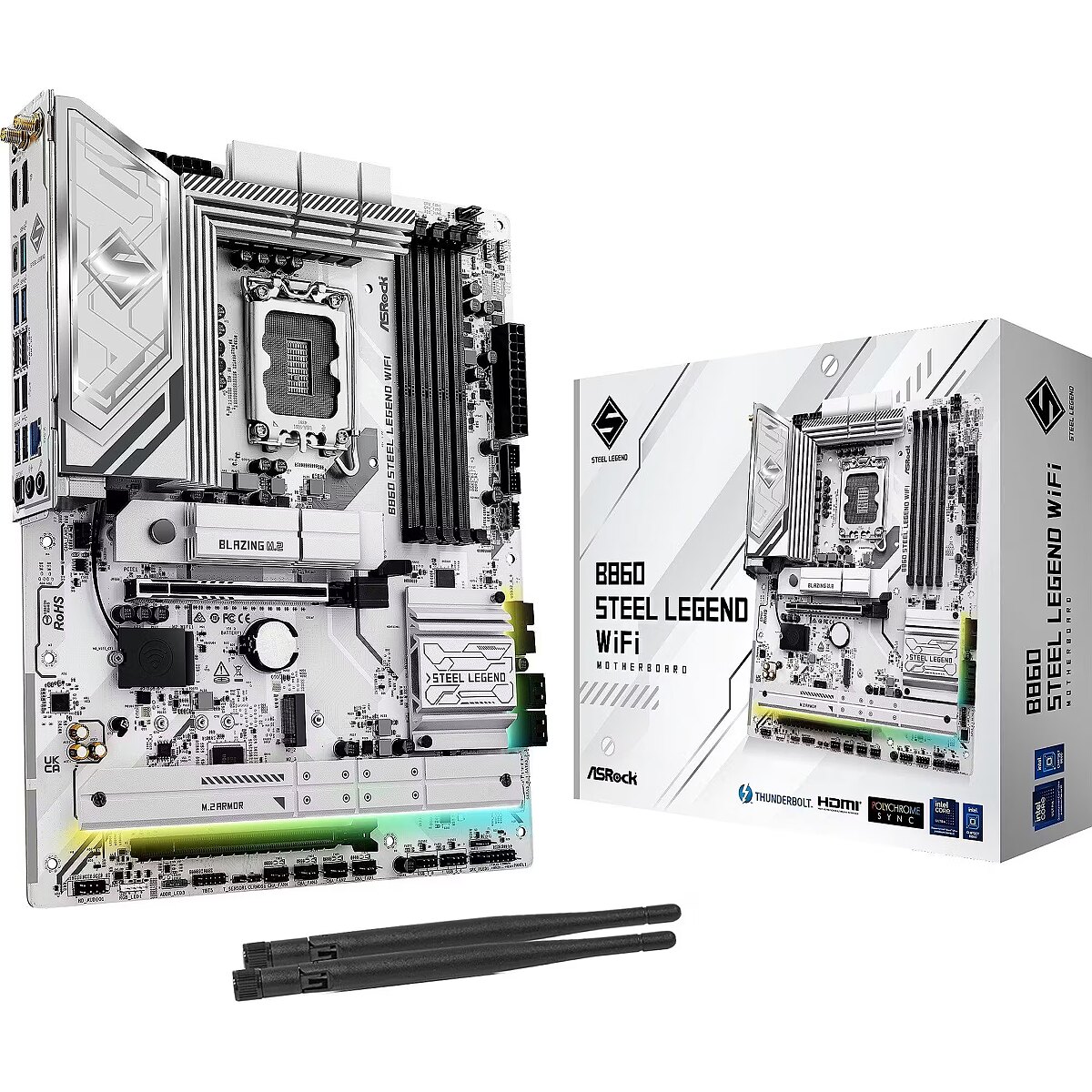 Description - Steel Legend represents the philosophical state of rock-solid durability and irresistible aesthetics. Built around most demanding specs and features, the Steel Legend series aims at daily users and mainstream enthusiasts! Providing a strong array of materials/components to ensure a stable and reliable performance. Supports Intel® Core™ Ultra Processors (Series 2) 14+1+1+1+1 Phase Power Design, 80A Dr.MOS for VCore+GT+SA 4 x DDR5 DIMMs Supports Dual Channel, up to 8666+ (OC) 1 PCIe 5.0 x16, 1 PCIe 4.0 x16 Graphics Output Options: 1 HDMI, 1 DisplayPort, 1 Thunderbolt™ 4 Type-C Realtek ALC1220 7.1 CH HD Audio Codec, Nahimic Audio 1 Blazing M.2 (PCIe Gen5x4) 2 Hyper M.2 (PCIe Gen4x4) 1 M.2 (PCIe Gen4x2) 4 SATA3 1 Thunderbolt™ 4 Type-C (Rear) 1 USB 3.2 Gen2x2 Type-C (Front) 2 USB 3.2 Gen2 (Rear) 8 USB 3.2 Gen1 (4 Rear, 4 Front) 7 USB 2.0 (3 Rear, 4 Front) Realtek 2.5G LAN 802.11axe Wi-Fi 6E + Bluetooth Supports Lite Release Design, Toolless Multi-Layer M.2 Heatsink