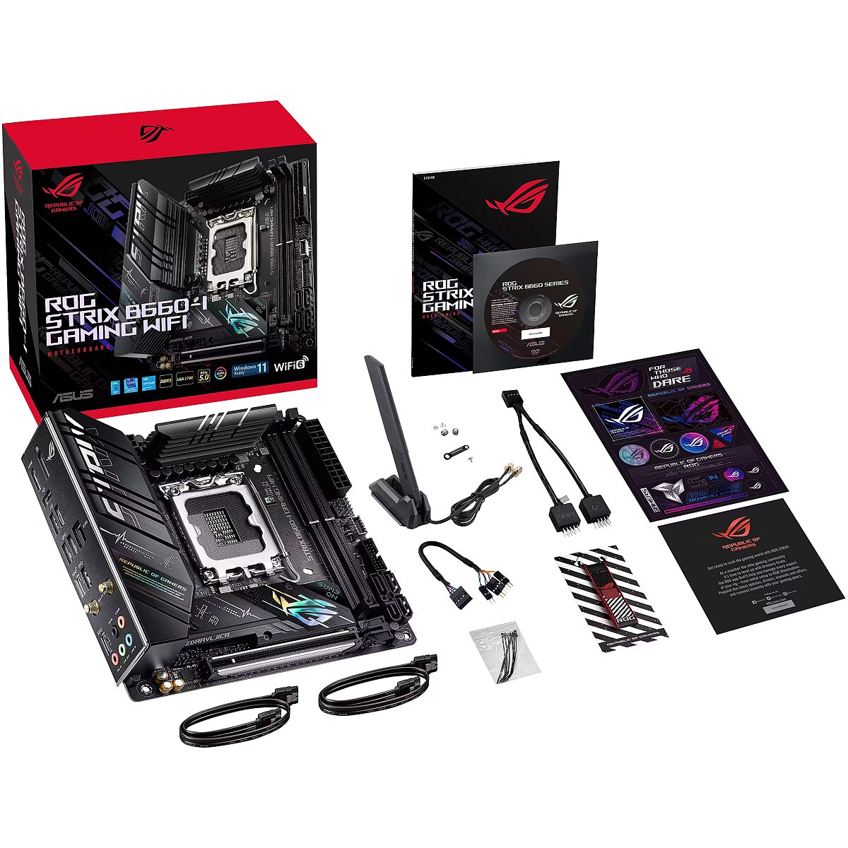 LongDesc - The ROG Strix B660-I Gaming WiFi packs premium-grade power delivery into a compact mini-ITX form factor to unleash the full force of 12th Gen Intel® Core™ processors. Framerates and load times can be boosted even further by all-new support for DDR5 memory and PCIe® 5.0, plus AI-enhanced controls and exclusive ASUS Enhanced Memory Profile tuning. Meanwhile, onboard WiFi 6 and two PCIe 4.0 M.2 slots bring lightning-fast performance to an endless variety of scenarios. On top of all that, DIY-friendly innovations help simplify the PC building process, so even novice builders can get right into serious gaming.TEAMED POWER STAGES8+1 power stages combine high-side and low-side MOSFETS and drivers into a single package, delivering the power and efficiency that the latest Intel processors can take full advantage of.ALLOY CHOKES AND DURABLE CAPACITORSHigh-end chokes and durable capacitors are engineered to resist extreme temperatures, enabling performance that exceeds industry standards.PROCOOL POWER CONNECTORThe ASUS ProCool socket is built to exacting specifications to ensure flush contact with the PSU power lines, enabling lower impedance and better heat dissipation.DIGI+ POWER CONTROLThe Digi+ voltage regulator module (VRM) is one of the finest in the industry, ensuring ultra-smooth and clean power delivery to the CPU.EIGHT-LAYER PCBA multi-layered printed circuit board design quickly dissipates heat around the voltage regulators to improve overall system stability and provide the CPU with more overclocking headroom.OOLER BY DESIGNROG Strix B660 motherboards feature comprehensive cooling options that configurable via the Fan Xpert 4 tool in Armoury Crate or within the UEFI BIOS.TWO-WAY AI NOISE CANCELATIONThis powerful ASUS-exclusive utility leverages a massive deep-learning database to reduce background noise from the microphone* and incoming audio while preserving voices. Distracting keyboard clatter, mouse clicks and other ambient noises are removed so you can hear and be heard with perfect clarity while gaming or during calls.*A splitter cable is necessary when using a 3.5 mm headset.AI COOLINGASUS AI Cooling technology automatically manages and controls motherboard-connected fans to ensure optimal settings based on current system load and temperature.AI NETWORKINGThe proprietary ROG GameFirst VI utility is designed to help all users — beginners, experts, and everyone in between — optimize network settings to ensure smooth online gameplay. New to this generation, GameFirst VI features AI-enhanced identification and boost technologies to ensure faster and smarter network optimization.IdentificationGameFirst VI analyzes usage patterns and the digital signatures of your applications and compares them to a database of over 200,000 apps.BoostGameFirst VI intelligently switches application priority and adjusts bandwidth, depending on the situation. When gaming, it accelerates and prioritizes game packets to give you supersmooth online gameplay ― even when you're streaming high-quality video or transferring large files.VisualizationAn intuitive graph provides an overview of real-time network status. Simply click on the tab to view the current bandwidth usage of each application, geolocation status of each network connection, or an analysis of the WiFi channels.DDR5 overclocking strengthComprehensive memory tuning options are the cornerstone of ROG motherboards. For DDR5, ROG Strix B660-I Gaming WiFi breaks performance limits by providing a stacked suite of overclocking parameters for not only high-speed kits, but even entry-level memory modules that have a locked power management IC (PMIC).A dedicated circuit on the motherboard safely circumvents DDR5 memory PMIC restrictions, allowing you to step past the default 1.1-volt limit and push frequency and timings to the max.Ordinarily, a restricted PMIC that has been unlocked requires the system to be fully power-cycled each time memory voltage is adjusted. ROG motherboards leverage onboard hardware and firmware to cleverly work around this irksome limitation, enabling voltage adjustments to be applied through the same soft system-reset process employed for previous generations of DDR memory.For users new to memory overclocking, ROG Strix B660-I Gaming WiFi includes the exclusive ASUS Enhanced Memory Profile (AEMP)* firmware feature for PMIC-restricted memory modules.WIFI 6 (802.11 AX)Onboard WiFi 6 (802.11ax) supports ultrafast wireless-networking speeds, improved capacity and better performance in dense wireless environments, providing exceptional online gaming experiences. Pair your motherboard with ASUS WiFi 6 routers to fully experience the networking potential of WiFi 6.Intel 2.5 Gb EthernetOnboard 2.5 Gb Ethernet gives your wired connection a boost, with up to a 2.5x improvement over standard Ethernet connections for faster file transfers, smoother lag-free gaming and high-res video streaming.SUPREMEFXROG SupremeFX is a unique blend of hardware and software that provides superior audio. In ROG Strix B660-I Gaming WiFi, SupremeFX features the S1220A codec to increase playback resolution from 192 kHz to 384 kHz across all channels. The front-panel output is streamed through a highly integrated Savitech amplifier that’s capable of driving of a wide variety of gaming headsets and high-fidelity headphones.UNDENIABLY ROG STRIXThe stealthy black aesthetic of ROG Strix B660-I Gaming WiFi is complemented by an iridescent ROG logo on the M.2 heatsink cover, touches of pixelated retro gaming art, and an understated but stylish Strix nameplate on the I/O shroud.M.2 Q-LATCHThe innovative Q-Latch makes it easy to install or remove an M.2 SSD without the need for specific tools. The design employs a simple locking mechanism to secure the drive and neatly eliminate traditional screws.CERTIFIED COMPATIBILITYROG Strix motherboards undergo an extensive certification program to ensure compatibility with the widest range of components and de