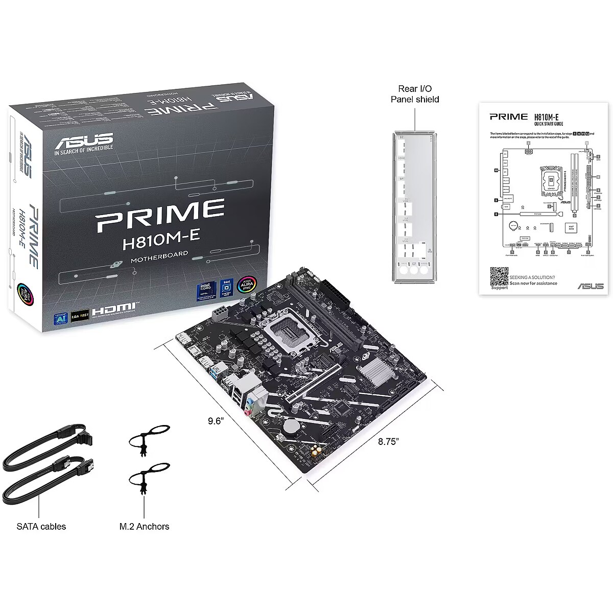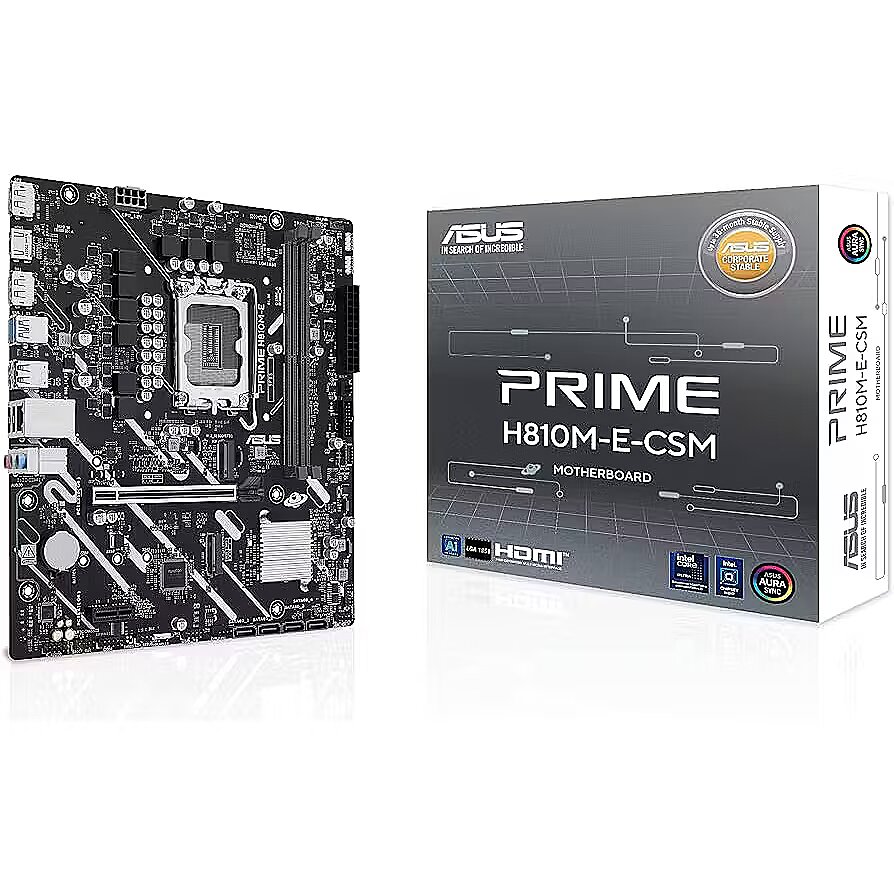 LongSummaryDescription - ASUS PRIME H810M-E-CSM. Processor manufacturer: Intel, Processor socket: LGA 1851 (Socket V1), Compatible processor series: Intel Core Ultra (Series 2). Supported memory types: DDR5-SDRAM, Maximum internal memory: 128 GB, Memory slots type: DIMM. Supported storage drive interfaces: M.2, SATA III, Supported storage drive types: HDD & SSD. Ethernet interface type: Gigabit Ethernet. Component for: PC, Motherboard form factor: micro ATX, Motherboard chipset family: Intel