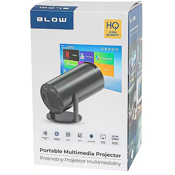 The BLOW projector is a modern device that allows you to watch movies, shows, games, and other multimedia content on a large screen. The projector comes with a built-in Android 13 operating system, which provides access to numerous apps and online services. You can connect to the projector via Wi-Fi, Bluetooth, HDMI, USB, or AV. The projector has a native 720p resolution and supports 4K decoding, ensuring high image quality. A brightness of 250 ANSI lumens and a contrast ratio of 1500:1 ensure clear and vibrant images, even in dimly lit rooms.