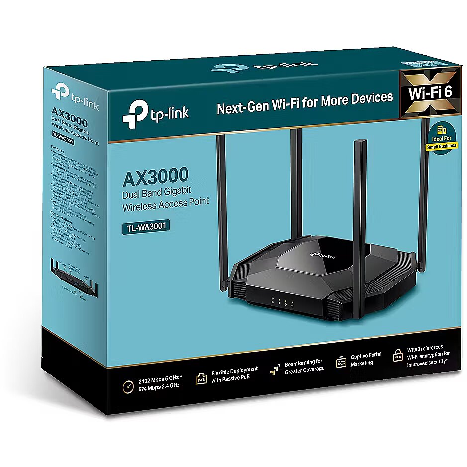 LongDesc - The Next Generation of Wi-Fi is Upon UsWi-Fi 6 (802.11ax) could turn out to be the most significant advancement in Wi-Fi development, delivering a huge boost in speed and total capacity. Mainstream adoption of Wi-Fi 6 is inching ever closer with more and more AX clients available. It's the right time to upgrade your router to the newest generation of Wi-Fi!Lightning-Fast AX3000 Dual Band Wi-FiUpgrade your home or office network with the latest-generation of dual band 802.11ax access point, which offers combined speeds of up to 3000Mbps and is perfectly suited to serve multiple devices at the same time. The 5GHz band is ideal for Ultra-HD streaming video and online gaming, while the 2.4GHz band is there for all of your everyday Internet needs, like sending email and browsing the Internet.Gigabit-Class Wired PerformanceThe gigabit Ethernet port makes full use of gigabit-class bandwidth provided by a local ISP to ensure reliable network connections. It also provides an ultra-fast connection for wired devices such as PCs, IPTVs, and game consoles, etc.Boosted Wi-Fi CoverageFour external antennas equipped with Beamforming technology concentrate Wi-Fi signals towards your devices to extend reliable Wi-Fi to every corner of your home or office—even over long distances.Deploy Anywhere with Just One CablePower over Ethernet (PoE) allows your Ethernet cable to carry electrical power and data simultaneously, making deployment effortless and flexible. An elegant appearance and simple mounting design make it easy to attach the Access Point to any wall or desktop, blending in perfectly with most interior decoration.Captive Portal MarketingCaptive Portal provides a secure guest network and offers unique marketing opportunities, especially for small businesses like cafes or salons. Utilize a flexibly designed portal page—requiring customers to view an advertisement or accept a set of terms for internet access—to improve brand awareness or deliver marketing messages.Multi-Mode 4 in 1Multiple operation modes are supported to give you full flexibility to tailor the Access Point to fit your network's needs.