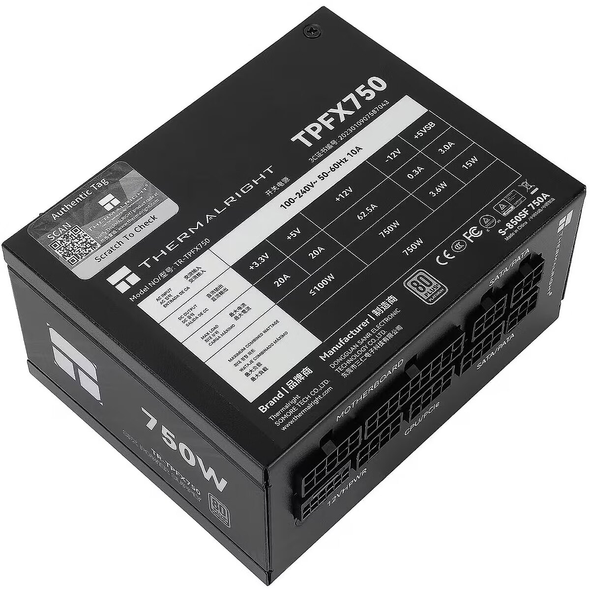 This Thermalright brand power supply unit has an 80 PLUS Platinum energy efficiency certificate and a power output of 750W.