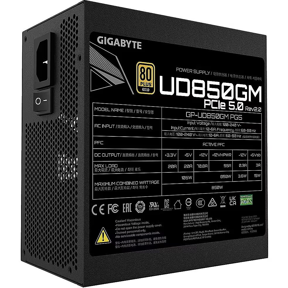 ShortSummaryDescription - GIGABYTE UD850GM PG5 V2 Power Supply Unit- PCIe Gen 5.1, 80 PLUS Gold, Fully Modular Design, 120mm Fan, ATX 3.1 compatible, EU Plug, 850 W, 100 - 240 V, 50/60 Hz, 12 - 6 A, Active, 105 W