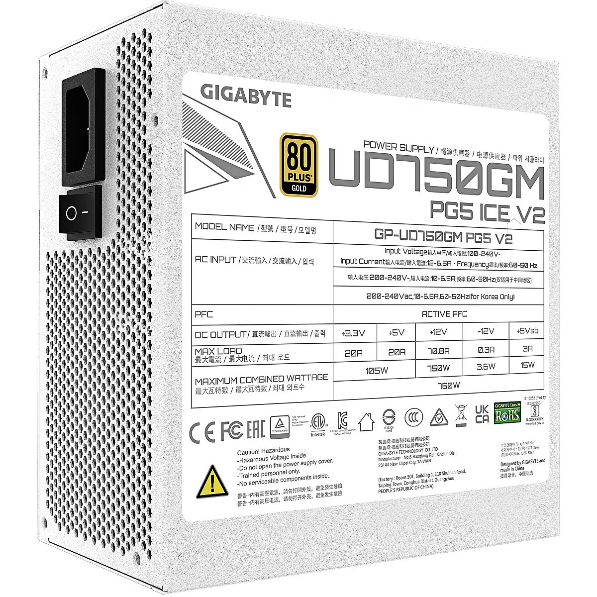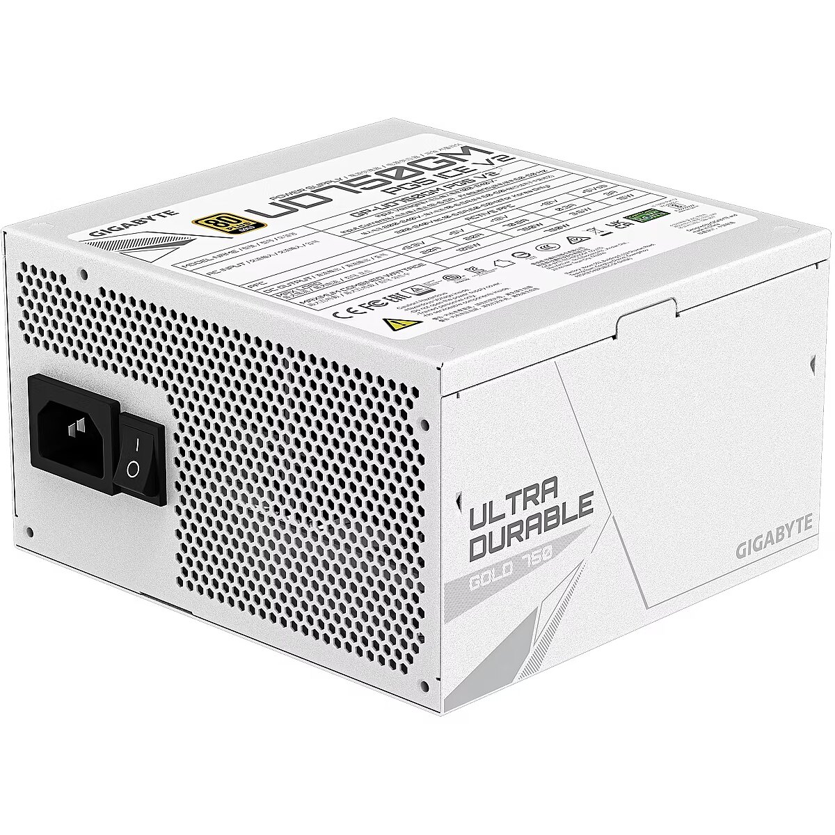 ShortSummaryDescription - GIGABYTE UD750GM PG5 V2 ICE Power Supply Unit- PCIe Gen 5.1, 80 PLUS Gold, Fully Modular Design, 120mm Fan, ATX 3.1 compatible, EU Plug, 750 W, 100 - 240 V, 50/60 Hz, 12 - 6.5 A, Active, 105 W