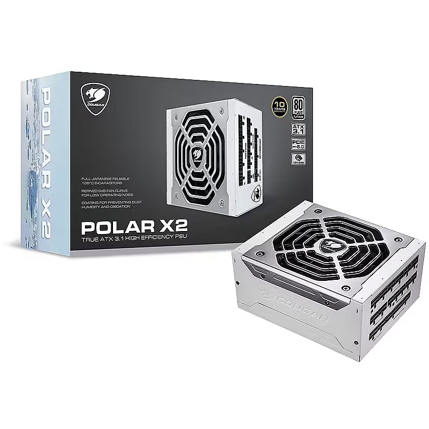 LongDesc - The Polar X2 passes the four strict power excursion tests from PSU ATX 3.1 Guide, in which the spike power consumption must bear up to 200% of the rated power for 100μs.The modular 12+4pin, 12V-2X6, cable delivers perfect power supplies for next-gen graphics cards.Without any 6+2pin adaptor, the 650mm length can reduce connection risk while the PC installation.COUGAR will present the first Platinum efficiency PSU Series, POLAR X2 1200 and 1050. The 100% Japanese capacitors and 50°C ambient operations with LLC, DC-DC structure generate an environmentally friendly PSU with high-efficiency performance. The fine-tune HDB fan with zero noise mode will also provide the perfect experience for all users in different conditions.EVERY OUTPUT IS WORTH SAVINGSave the Earth with Lesser Energy Loss- The Polar X2 series will reduce the energy waste below 7%.- With 80Plus Platinum certified to provide the efficiency level up to 92% at 115Vac.- Less efficiency loss with streamlined board-to-board wave soldering.ZERO NOISE MODEULTRA-SILENCE AT HIGH OUTPUTLower Heat Emission for Steady Temperature- Zero noise mode at 40% loading silent.- Automatic thermal control to provide an optimal speed-noise ratio.Using COUGAR’s 135mm HDB silent fan and large inhalation punched hole, the advanced frame increase the concentration of airflow and its fan curvature has been fine-tuned to reduce vibration.- Hybrid Dynamic Bearing (HDB) fan to expand the durability.- Patented groove design- Centralized oil pressure- No oil leakage- Improved stability- Less friction and noise- Extended lifespanJAPANESE CAPACITORSREFIND ELECTRONIC SOLUTIONReduce the E-waste for the Next Generation- 100% premium Japanese capacitor to prolong the longevity.- Optimally perform in 50ºC working temperature environments.- Tight 2% voltage regulation for ultra-stable operation. FeaturesSupport PCI Express 5.0 Graphics Cards 12+4 Pin ConnectorConnect the 12V-2X6 with true 200% power excursion dynamic outputs80PLUS Platinum CertifiedUp to 92% efficiency power conversion to cut down your electricity bill100% Refined Japanese CapacitorsOutstanding components extend the longevity of PSU.Durable HDB FanHydro Dynamic Bearing Fan: Extended durability and lower noise levelsZero Noise Mode and Fan Curve TuningAdvanced technology for noise minimizationFully Modular Power Supply UnitConnect only the cables you need for less clutter and better airflowFlawless Operation at 50°CPowerful performance at 50°C ambient temperatureCompatible with The Lastest PC TechnologyCreated for user with current and next-generation multi-core CPU platformsProtectionUVP (Under Voltage Protection)If the voltages fall below a certain tolerance value on the single lines, the PSU automatically switches off.OCP (Overcurrent Protection)If the current on a single line is higher than indicated, the PSU automatically switches off.SCP (Short-Circuit Protection)In the case of a short-circuit, this feature prevents damage to the core components of the PSU and its System components.OVP (Over Voltage Protection)If the voltages increase above a certain tolerance value on the single lines, the PSU automatically switches off.OTP (Over Temperature Protection)If the temperature gets too high, the PSU automatically switches off.OPP (Over Power Protection)If the system is oversized and requires more power from the PSU than it can provide, this protection function is activated.Conformal Coating ProtectionPrevention of conductive particles/dust, high humidity, and intruding insects