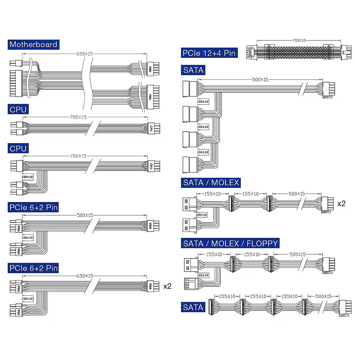 The power supply unit contains a connector designed for modern graphics cards, such as the Nvidia GeForce RTX 4070 or more powerful ones, the 1 x 600W 12VHPWR (5.0) plug. Lower-level graphics cards (for example, RTX 4060) will suffice with a standard 8-pin connector.