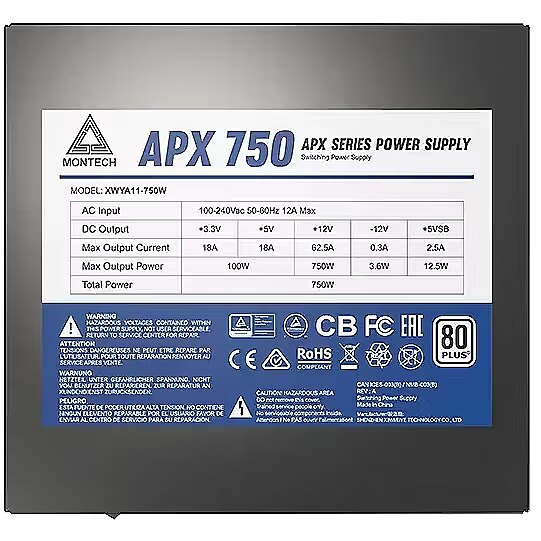 Summary - Montech APX750. Total power: 750 W, AC input voltage: 100 - 240 V, AC input frequency: 50/60 Hz. Motherboard power connector: 20+4 pin ATX. Purpose: PC, Power supply unit (PSU) form factor: ATX, 80 PLUS certification: 80 PLUS White. Product colour: Black, Fan diameter: 12 cm, Number of fans: 1 fan(s). Compliance certificates: CB, CE, EAC, Federal Communications Commission (FCC), RCM, RoHS, UKCA, cTUVus