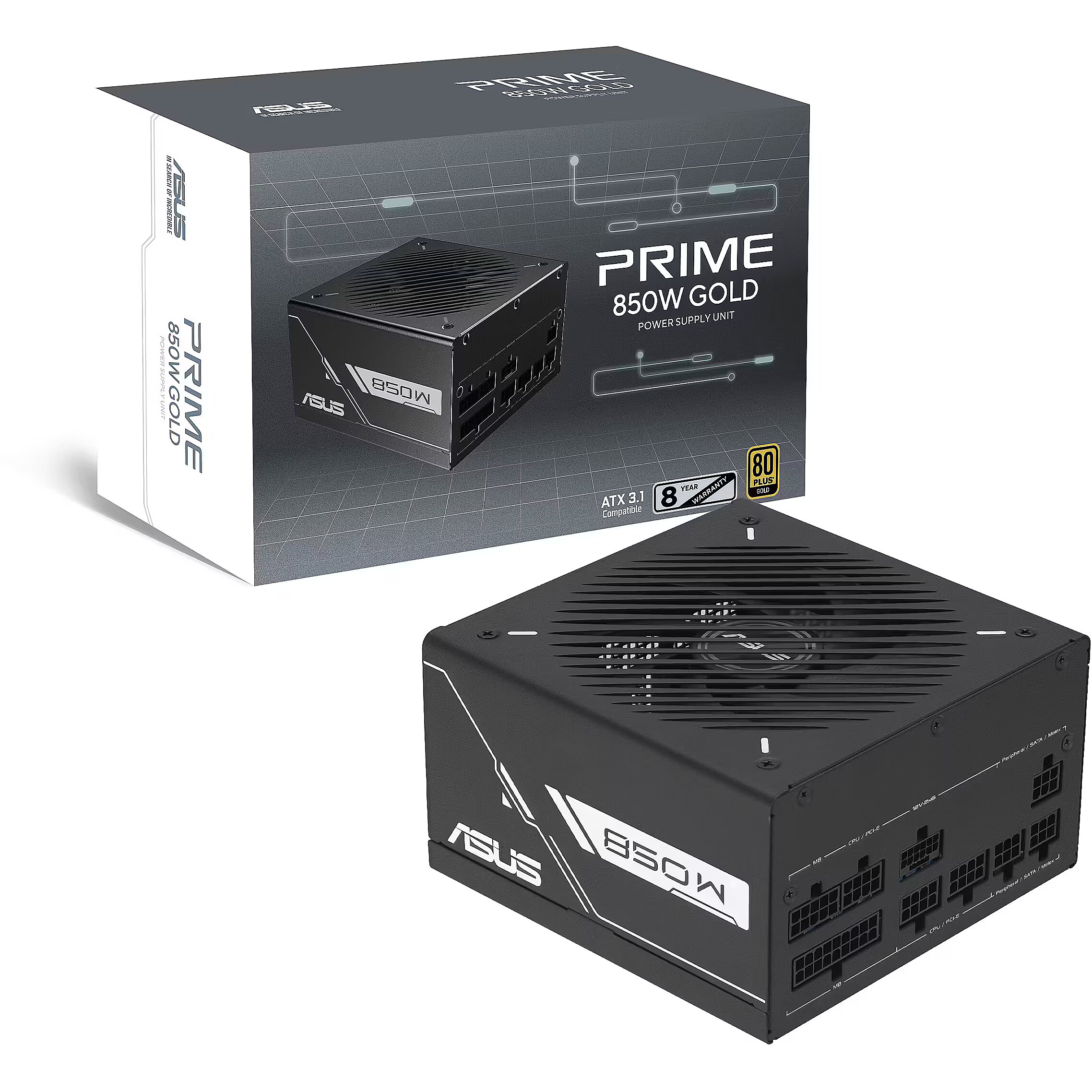 LongDesc - Prime 850W Gold Black EditionSTELLARPERFORMANCEA Prime Gold Black Edition power supply unit in a blue, space vibe background.With 80 PLUS and Cybenetics Gold certification, Dual-ball fan bearings, and an 8-year warranty, the ASUS Prime series PSU brings efficient and durable power delivery to high-performance workstations, all-round PCs, and gaming rigs.