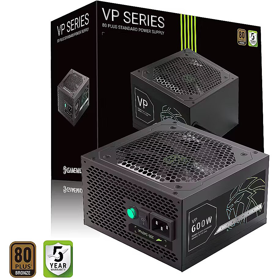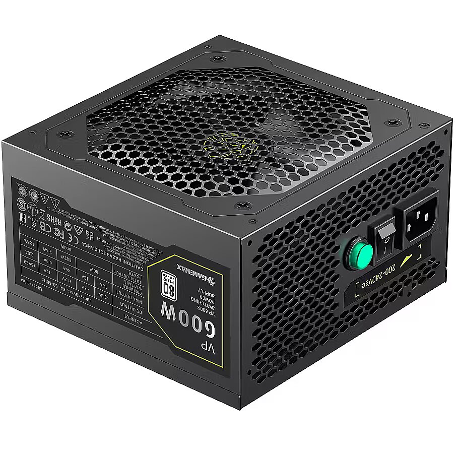 This Gamemax brand power supply unit has an 80 PLUS Bronze energy efficiency certificate and a power output of 600W.