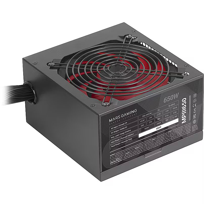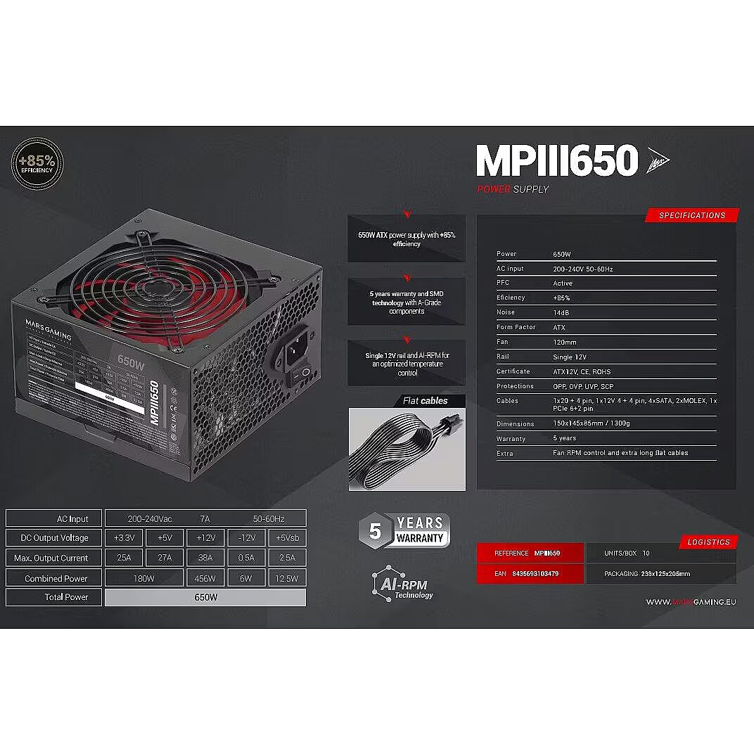 ShortSummaryDescription - Mars Gaming MPIII650 PC ATX 650W Power Supply 5 Years Warranty Silent AI-RPM Technology 85% Efficiency Black, 650 W, 200 - 240 V, 50/60 Hz, 7 A, Active, 180 W