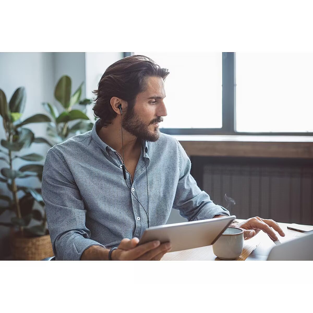 USB-C in-ear headphones with a remote control featuring easy-to-press buttons and a microphone on/off switch. Buds with a USB-C connector for a secure and comfortable fit. The built-in digital-to-analog converter reduces noise and improves sound quality, so you can enjoy clear calls and music in high-quality sound. Plug and play; no pairing/connection or charging is necessary to fully enjoy these headphones. Latency-free, also great for watching movies and playing games. Compact and lightweight earbuds recommended for long meetings and online classes. Pleasant sound thanks to a 10.7mm neodymium driver with strong magnetic force. Convenient remote control with three easy-to-press buttons: volume up/down, multi-function button, and a dedicated slide switch for microphone on/off. Sweat-resistant, IPX2 rated.
